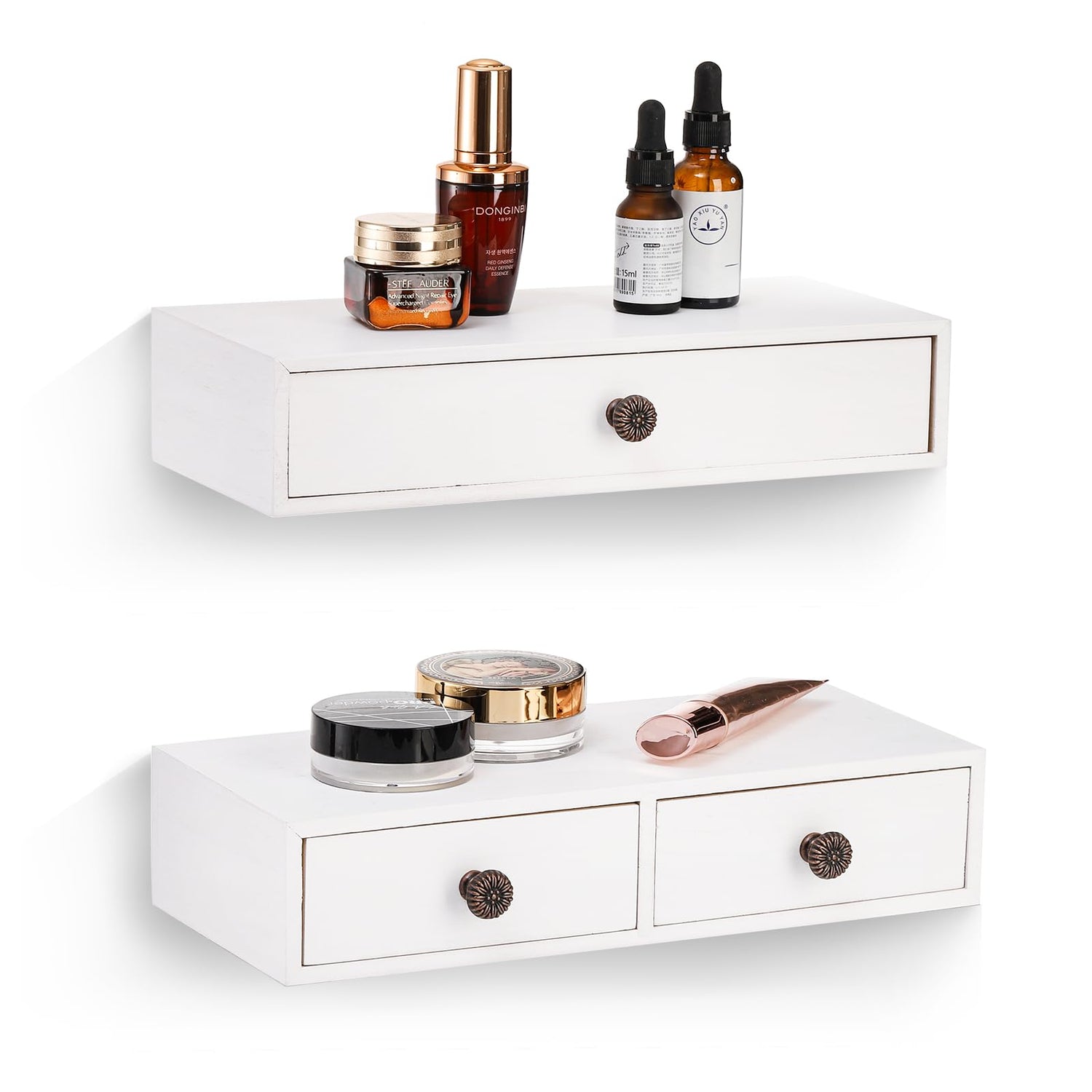 - White floating shelves. Set contain 1 pcs floating shelf with a long drawer and 1 pcs floating shelf with 2 small drawers. Measures with L 12.25 x W 5.25 x H 2.5 inch. It looks great as a single unit, as well as placing multiple units side-by-side. Please check the size before purchase.