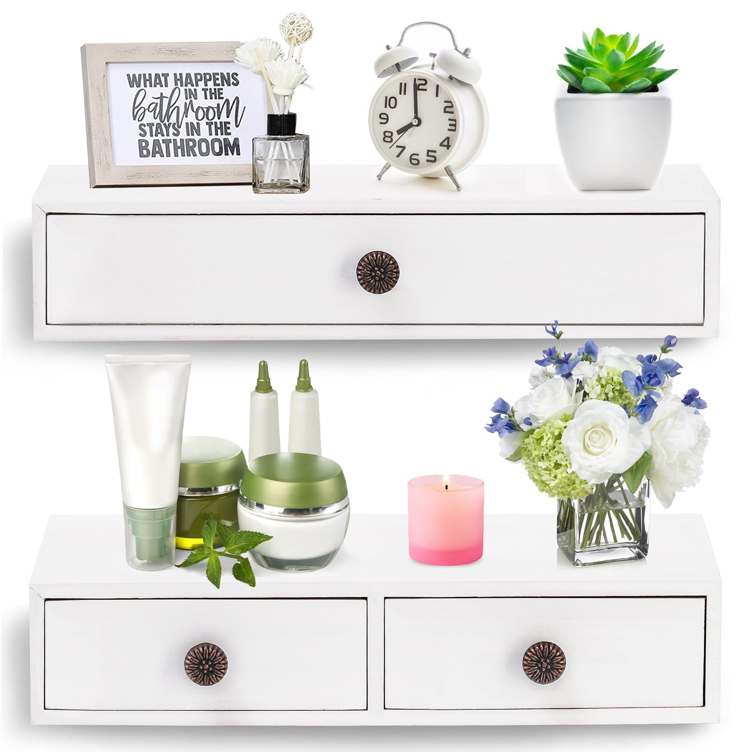 Yesland 2 Packs Floating Nightstand with Drawer - Rustic Wood Floating Wall Mounted Drawers Floating Shelf with Drawer for Living Room, Bedroom, Kitchen, Wall Decor, Storage, Display - White