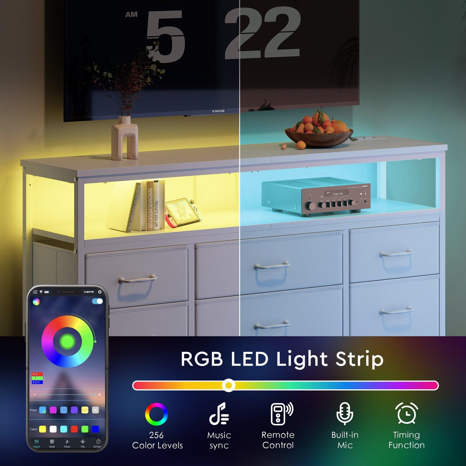 YeTom Tv Stand Dresser for Bedroom with Charging Station and LED Lights,9 Fabric Drawers White TV Stand with Open Shelf Storage,Media Console for TV ups to 55",Metal Frame,Wood Top,White