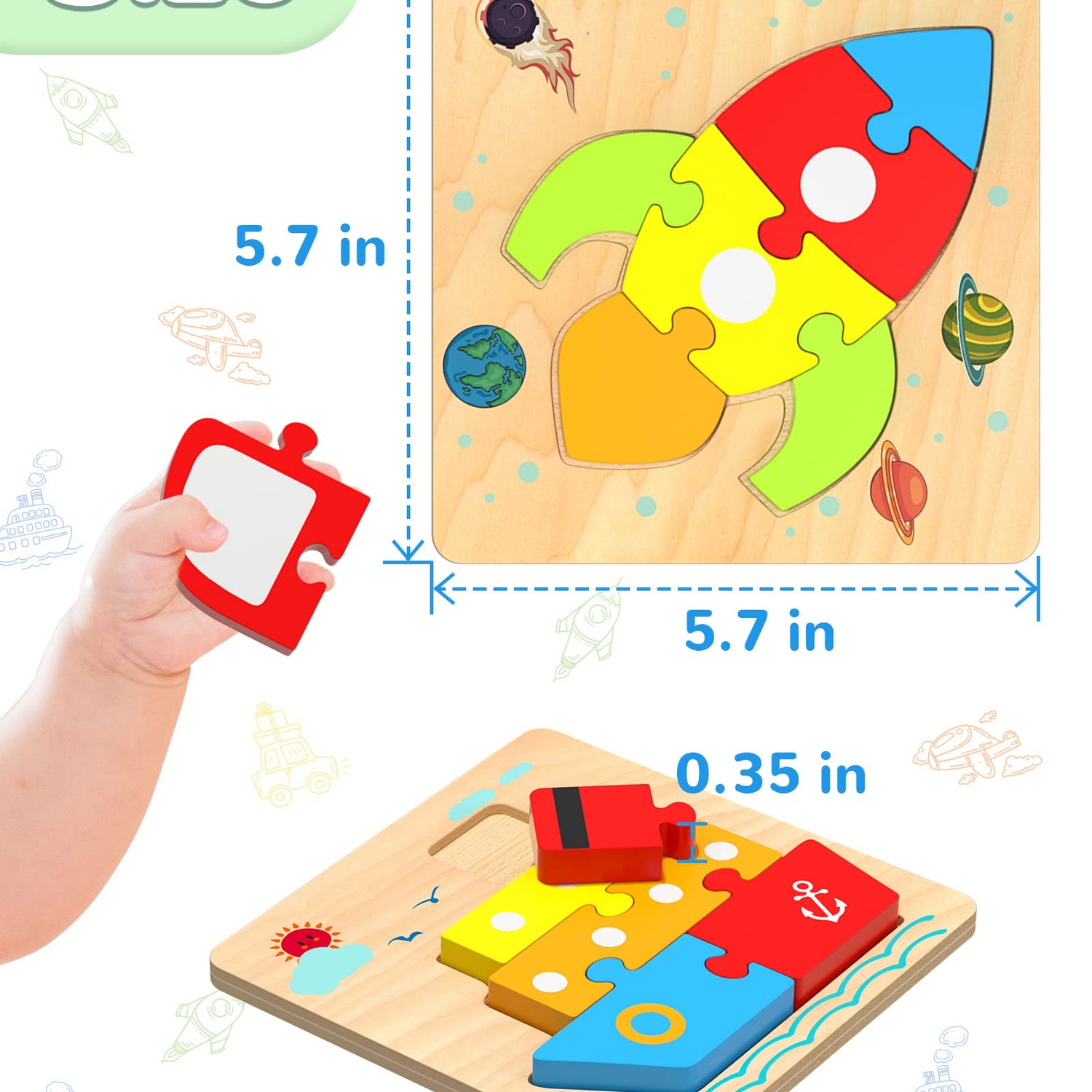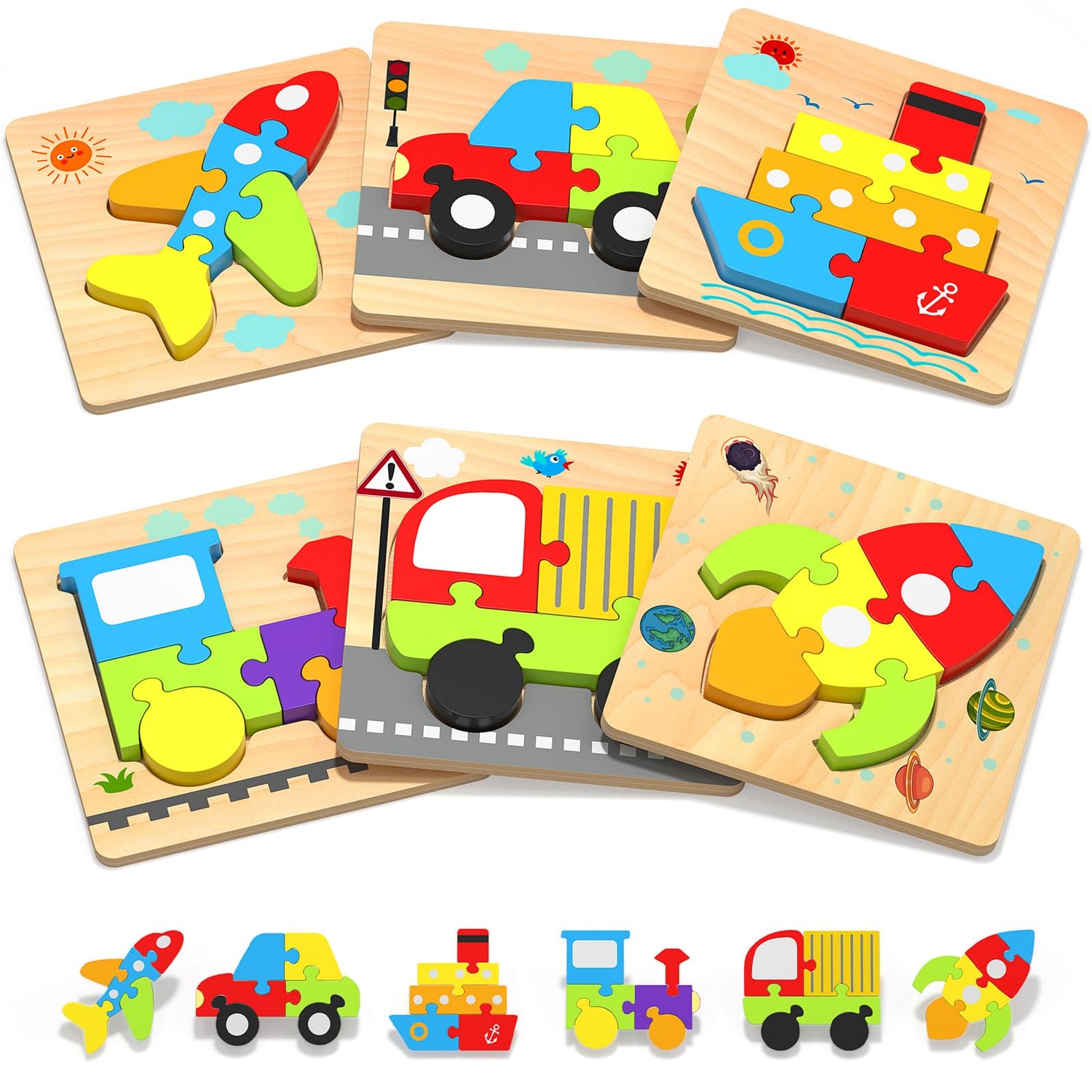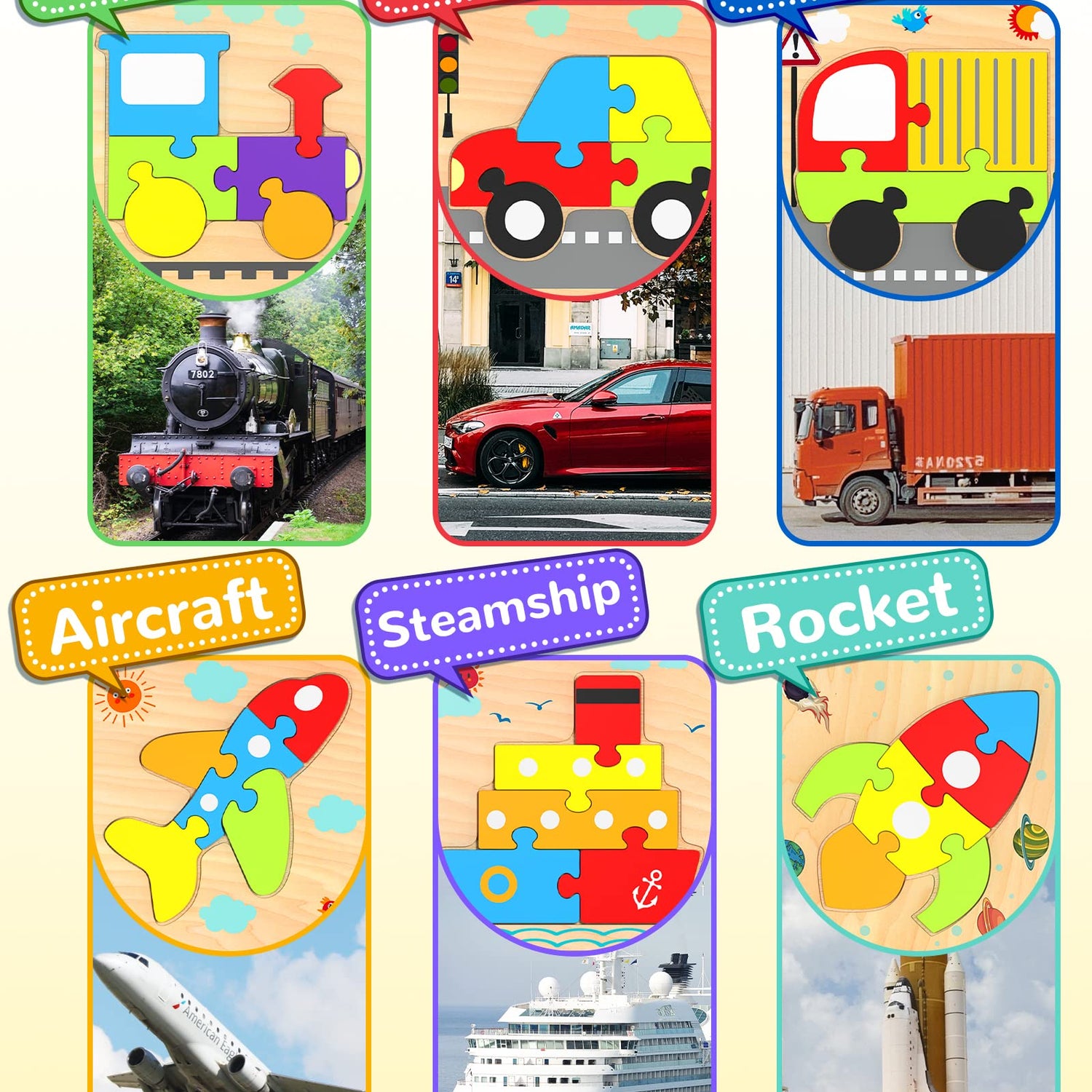 - LEARNING THROUGH PLAY: The montessori toys contain 6 pack well-selected vehicle jigsaw in the air, land, and sea, it includes a car, truck, aircraft, rocket, steamship and train.Jigsaw puzzles feed the developing minds of young kids, helping them practice fine motor skills, hand-eye coordination, and problem-solving. This puzzle also provides good opportunity for furthering verbal skills with colors, design, and vehicle names and inspiring imaginative adventures in young kids.