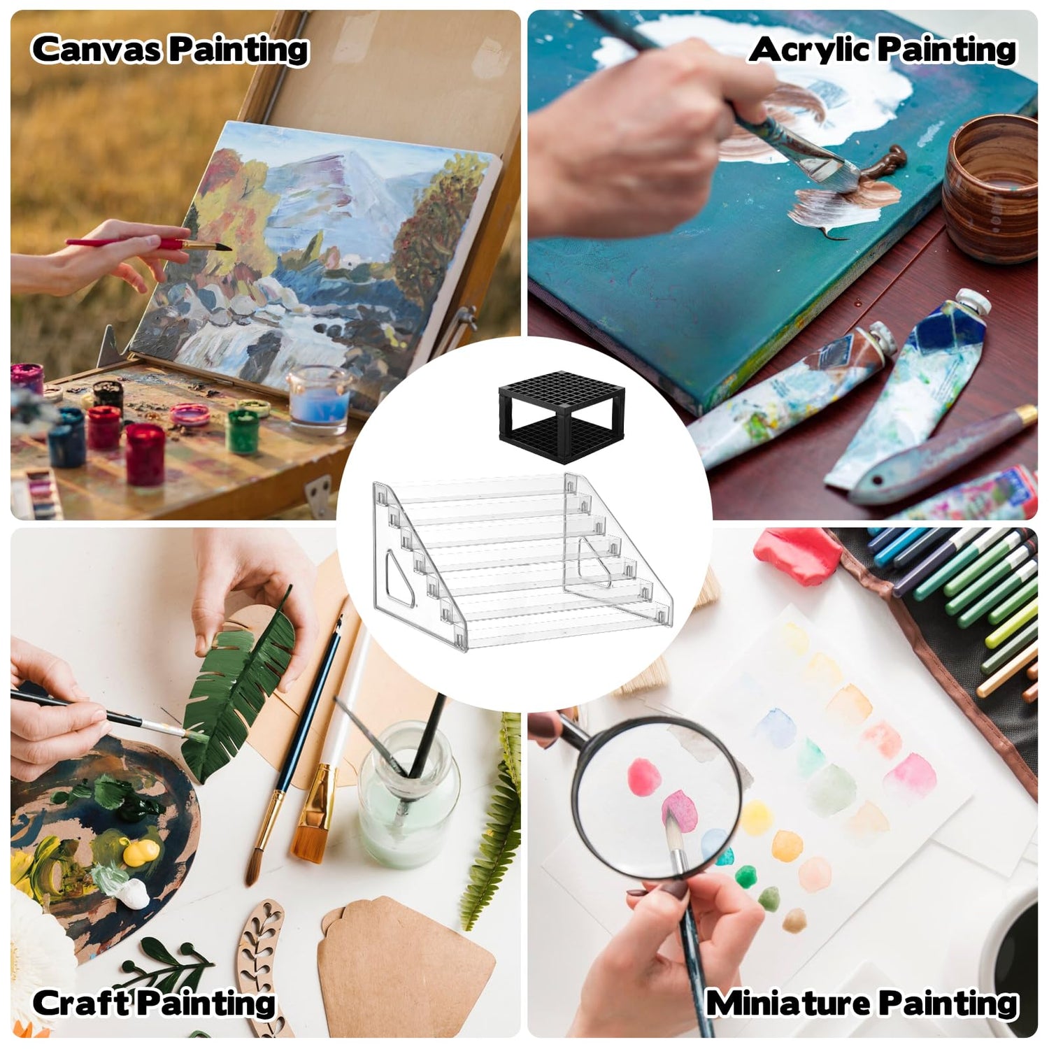 - Versatile Usage: Perfect for acrylic, oil, model, craft paints, or miniature paint jars, this organizer caters to professional artists and hobbyists. Our paint brush holder is an excellent accessory for managing paints and tools during acrylic painting, miniature art, model making, or canvas painting projects.
