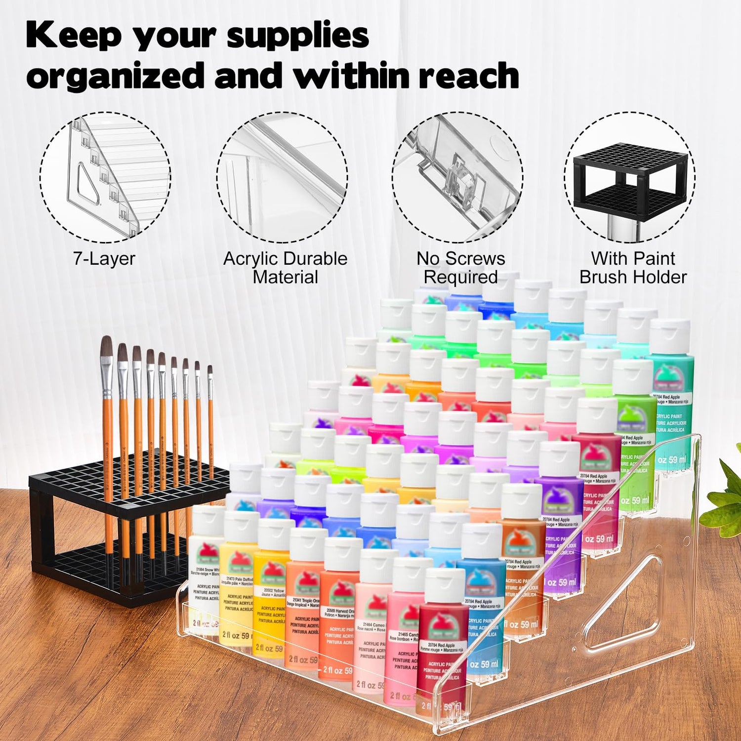 - 7-Tier Paint Organizer with Brush Holder: This 7-layer miniature paint holder features a vertical design, providing ample storage for crafting supplies. The organizer&brush holder set includes a black square brush holder to keep your painting brushes organized, offering a complete solution for paint storage, organization, and brush management.