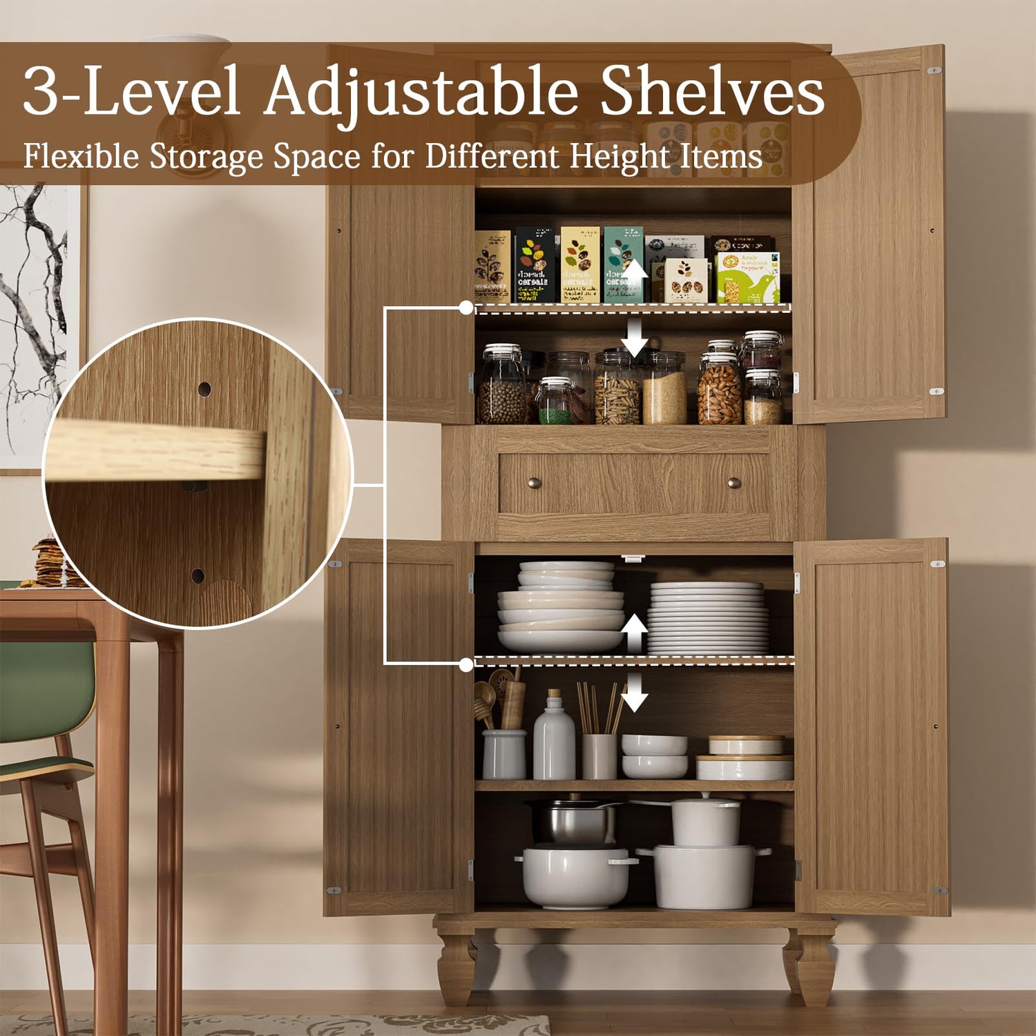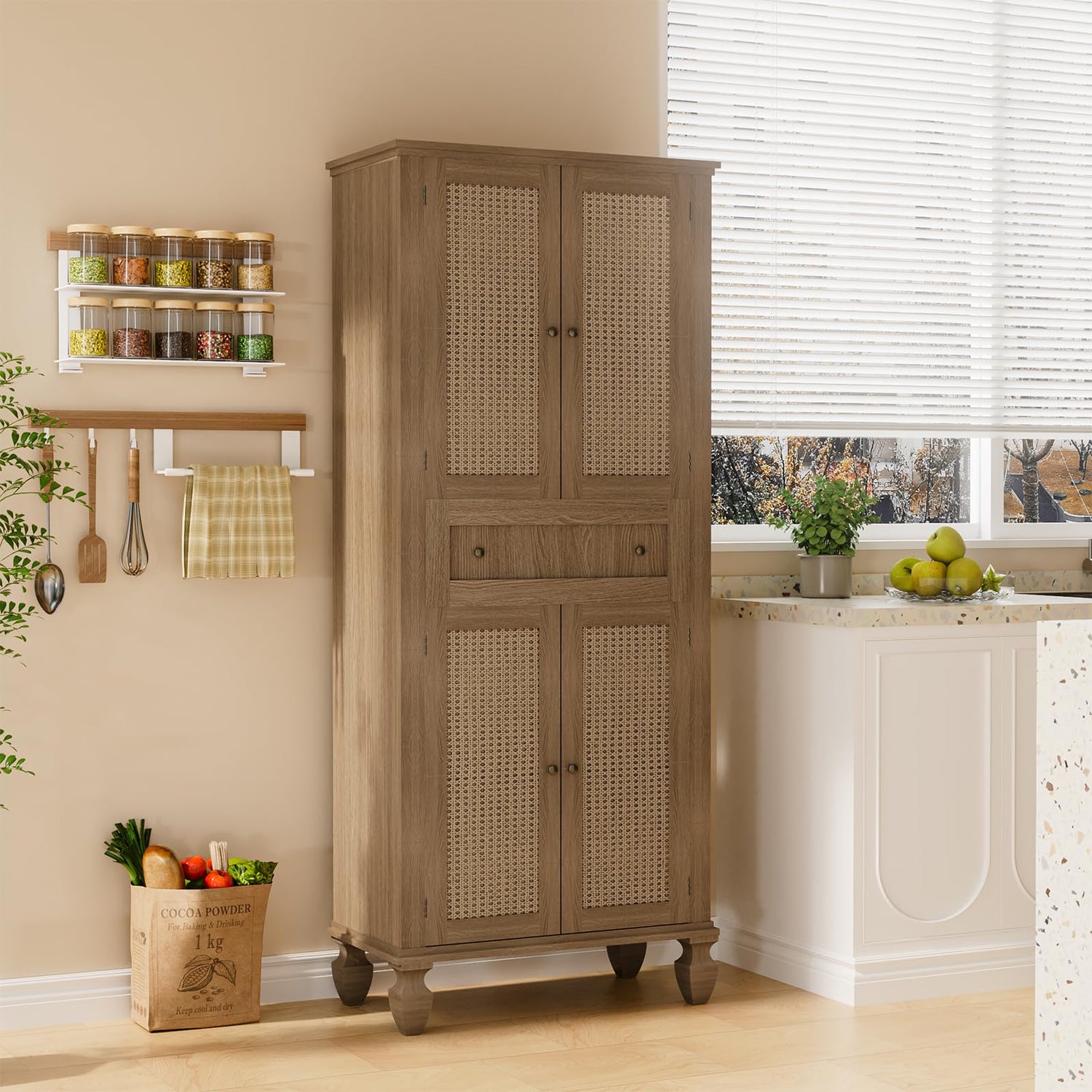 Yeyawomy 72" Tall Pantry Cabinet,Rattan Pantry Storage Cabinet,Large Kitchen Cabinet with Doors&Drawers,Freestanding Cupboard with Adjustable Shelves for Dining Room