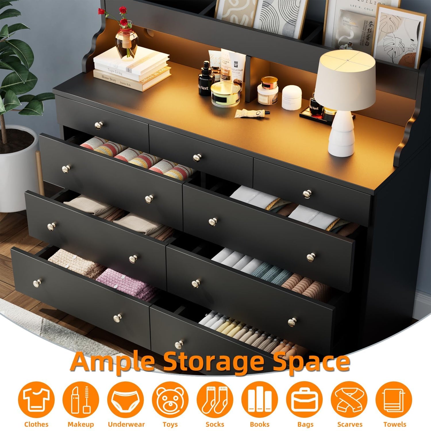 Yeyawomy 9 Drawer Dresser with Led Light and Charging Station, Anti-tip Chest of Drawers, Black Long Wood Dresser for Bedroom, Entryway, Hallway, Entryway, and Living Room