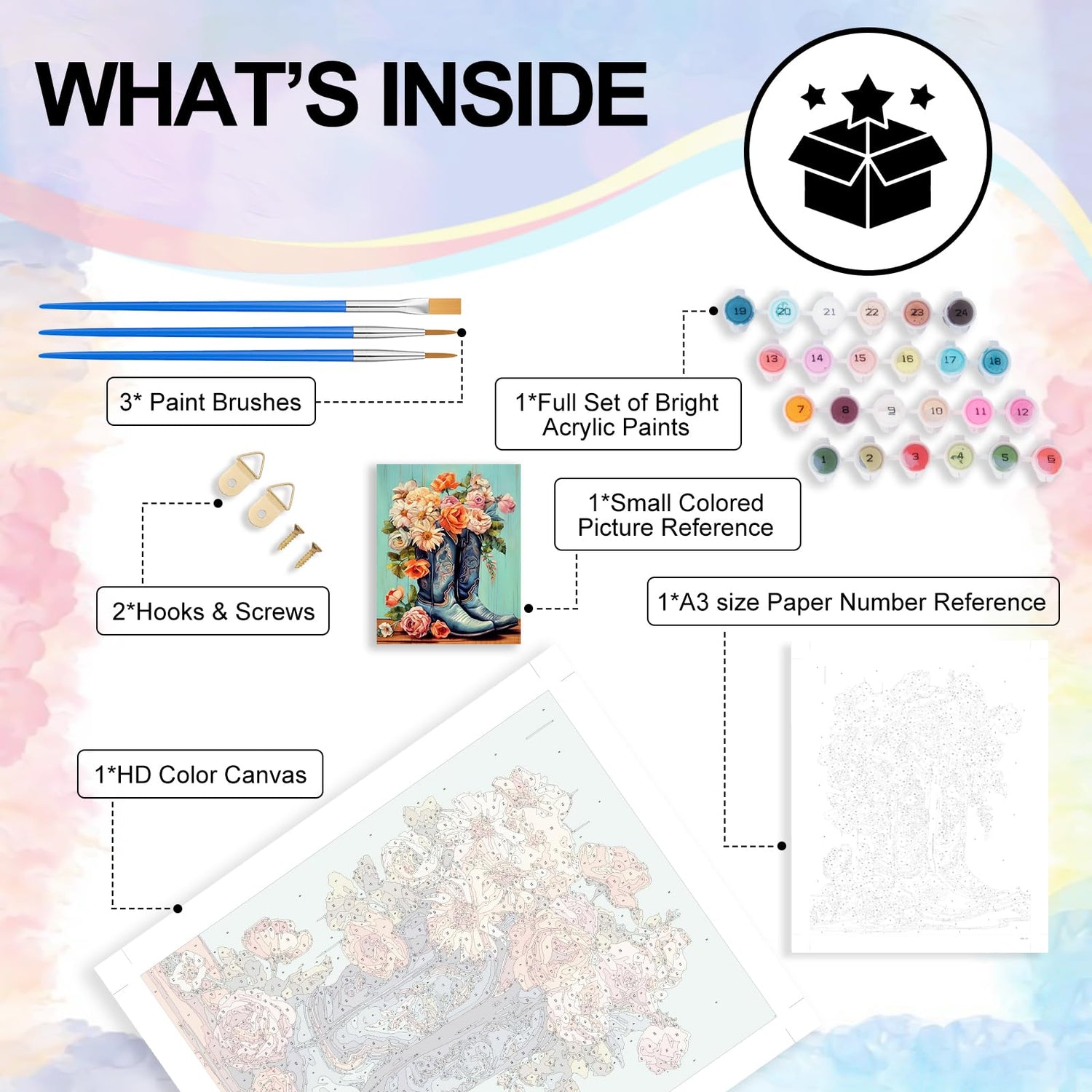 Yezavesu Cowboy Boots Paint by Numbers Kit for Adults Beginner, Flower Adult Paint by Number Kits on Canvas Without Frame, DIY Acrylic Painting by Numbers for Home Wall Decor Gift 16x20 Inch