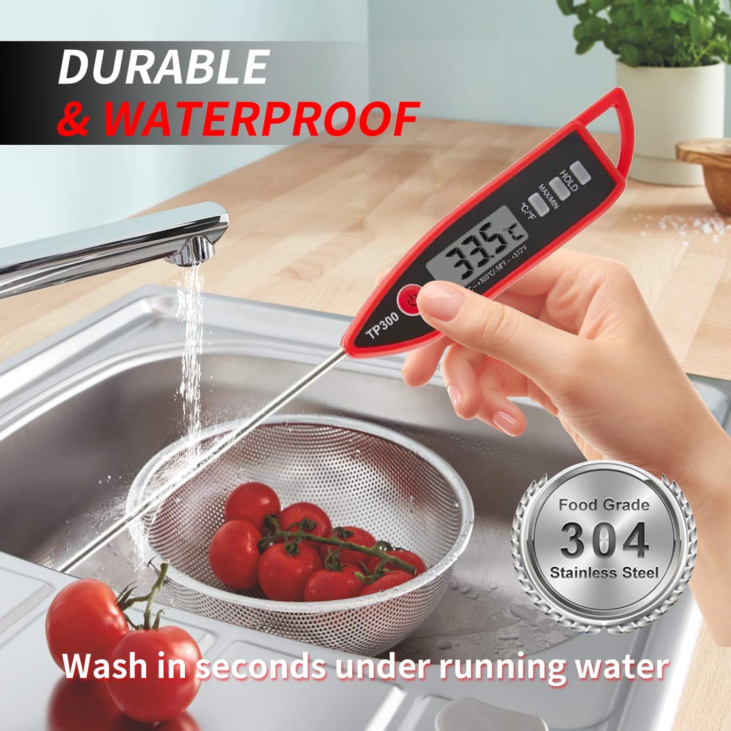 - 【SMART FEATURES, SIMPLE OPERATION】Easily °C/°F switch to suit your preference. Press the Hold button to lock the temperature for easy reading after removing the probe. Press Max/Min mode, allowing you to track temperature changes. The meat thermometer automatically turns off after 10 minutes of inactivity, saving battery life.