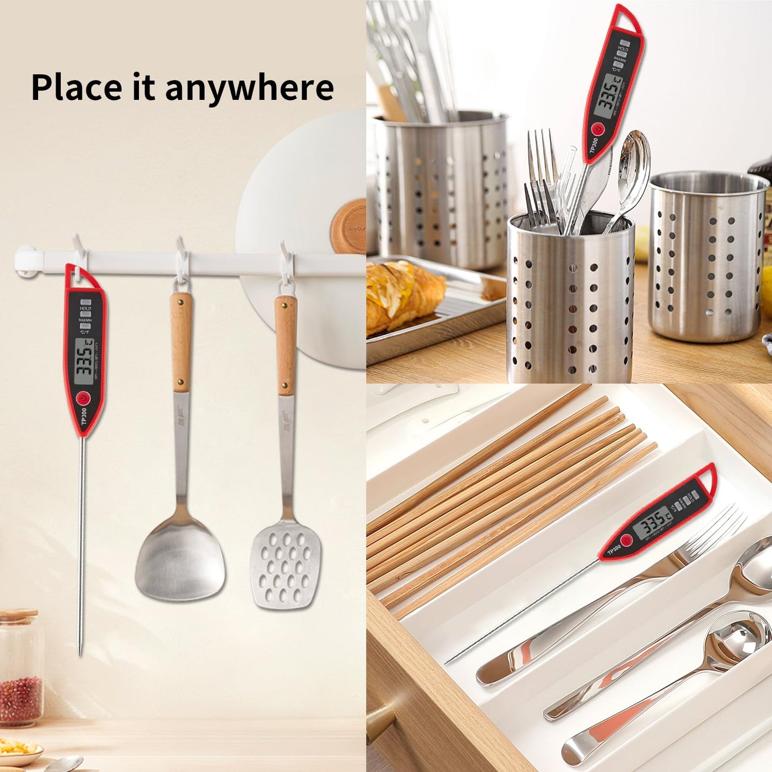 - 【304 STAINLESS STEEL PROBE FOR MULTIPLE USES】The food-grade 304 stainless steel probe of this cooking thermometer is suitable for a variety of cooking scenarios including ovens, microwaves, air fryers, deep fryers, grills, baking, grilling, turkey, steaks, beverages, liquids, breads.