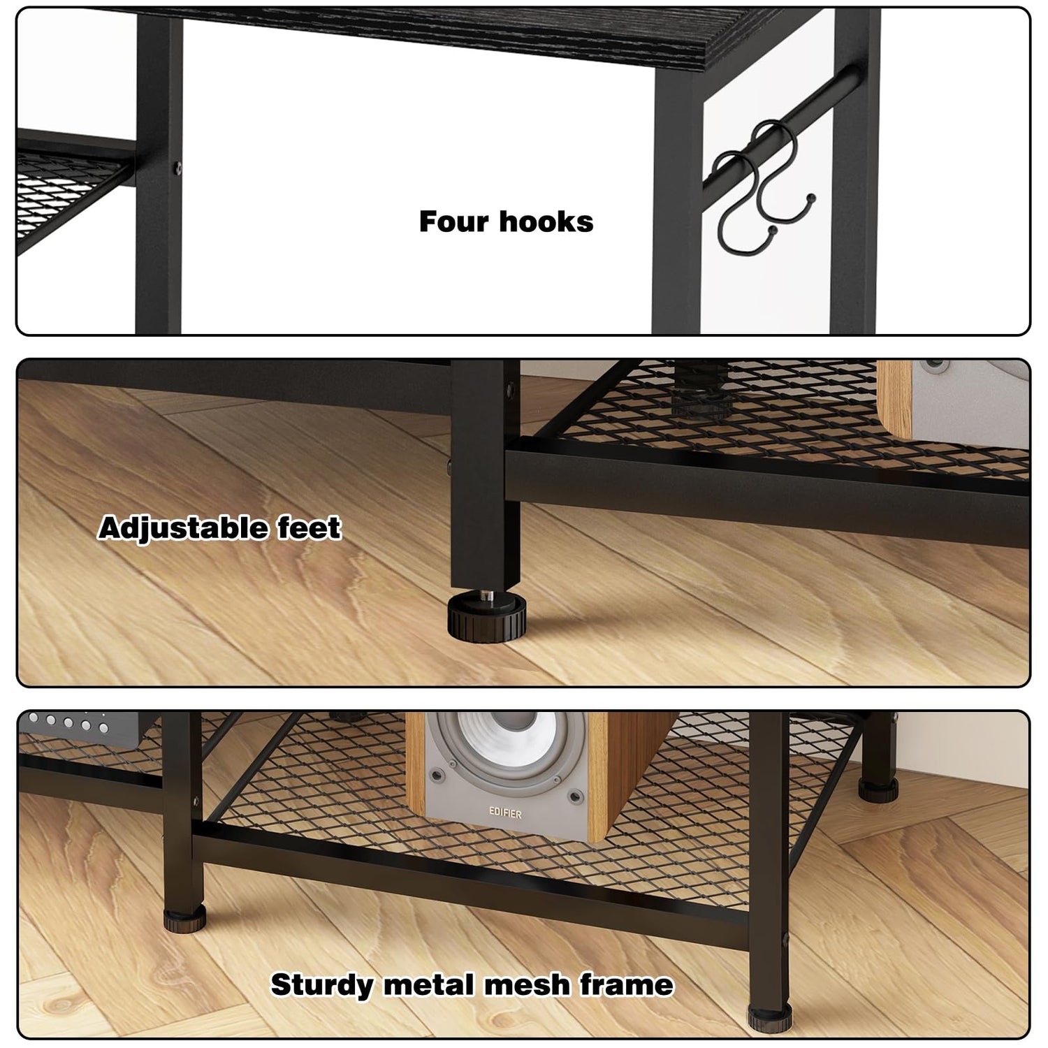 - OPEN STORAGE SPACE: For easy cooling of your devices, so this TV stand is pure mesh shelf open space design with 2 tiers of open mesh shelves and 4 hooks, extra large storage space to show off your media devices, gaming consoles, DVDs, Xbox, PS5 and more. Creating a personal entertainment center.