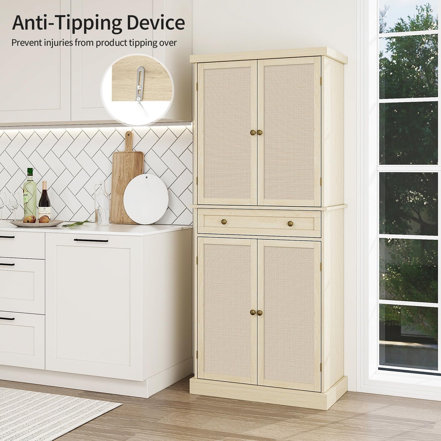 YHAOWORKS Kitchen Pantry Storage Cabinet - Rattan 4 Doors 1 Drawer Tall Cabinet with Adjustable Shelf and 6 Shelves, 72'' Freestanding Cupboard for Living Room, Dining Room, Bathroom (Natural)
