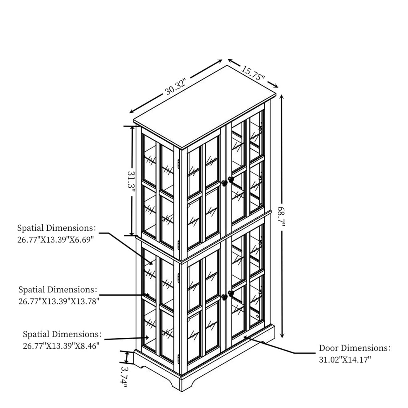 - Curio Cabinet with Adjustable Shelves: The size of the display cabinet is 68.70"H x 30.31"W x 15.75"D, 6 shelves, 4 are tempered glass shelves that can be adjusted, and each shelf can hold up to 25 lbs.Adjust the curio cabinet shelf to accommodate collections of all sizes.The 4 front hinged doors make it easy to rearrange, clean and organize the contents in the curio cabinet. Magnetic hardware keeps the doors securely closed in place