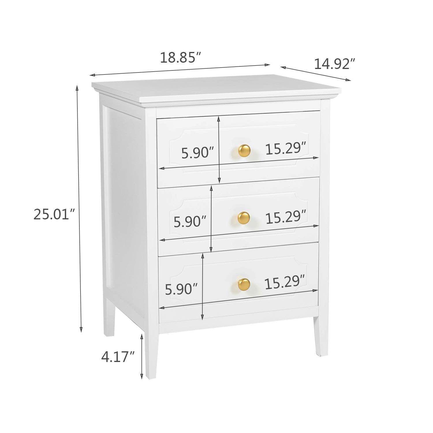- [Sturdy and Stable] : Crafted from manufactured wood, this nightstand end table boasts a smooth surface as well as sturdy quality. Measuring 18.85"w x 14.92"D x 25"H when fully assembled, it can perfectly fit into any room space. Tabletop is capable of storage up to 48kg/105.8lb while each drawer holds maximum load of 6kg/13lb for daily storage.