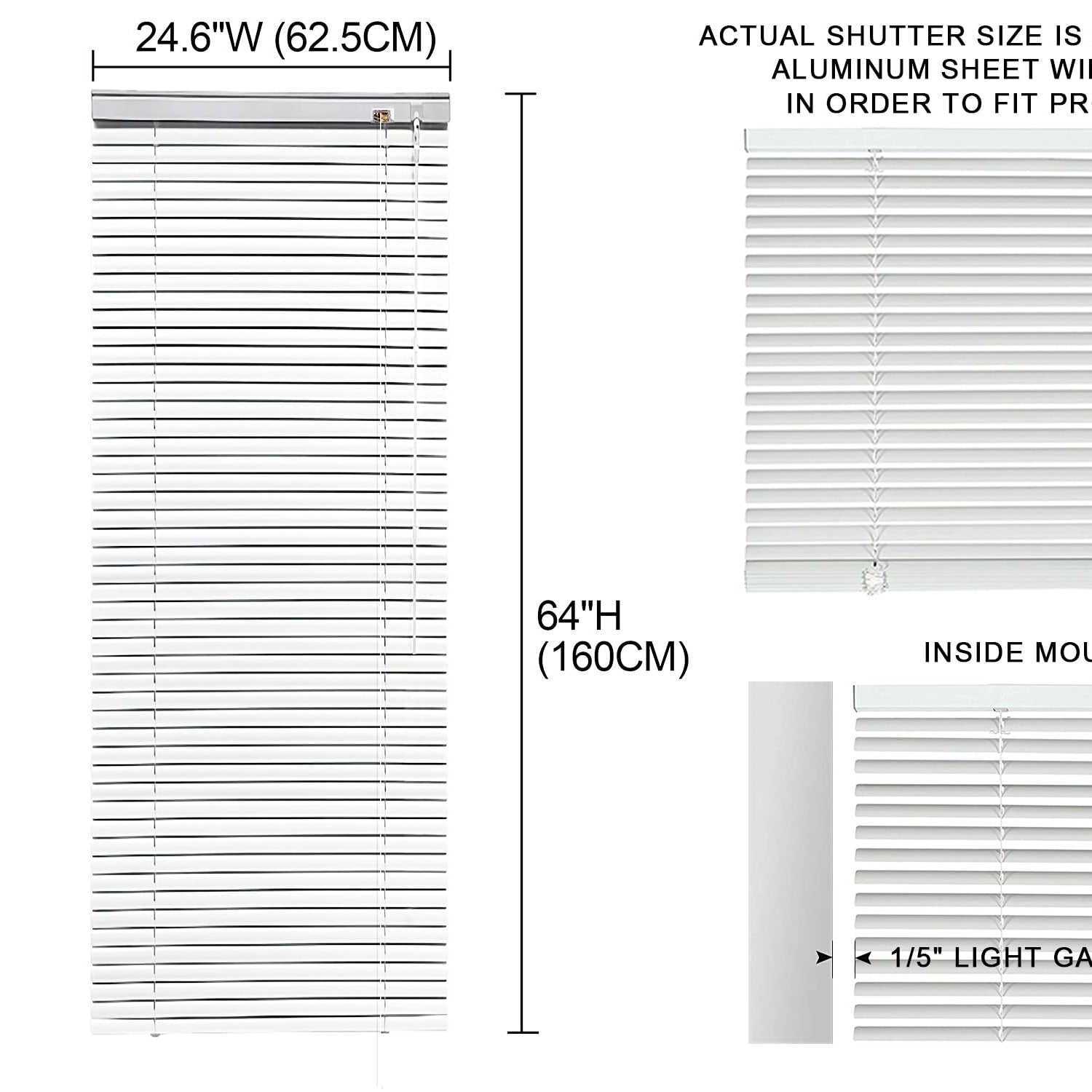 - IMPORTANT! - Internal and External Installation Problems:Aluminum blinds measure 24.6"W x 64"H.Inside mount,fits any window wider than 24.6inches,best for 25" wide windows;outside mount,most suitable 4" wider than window,like a minimum 20.6"W windows.So it can be installed on windows from 20.6" to 25".