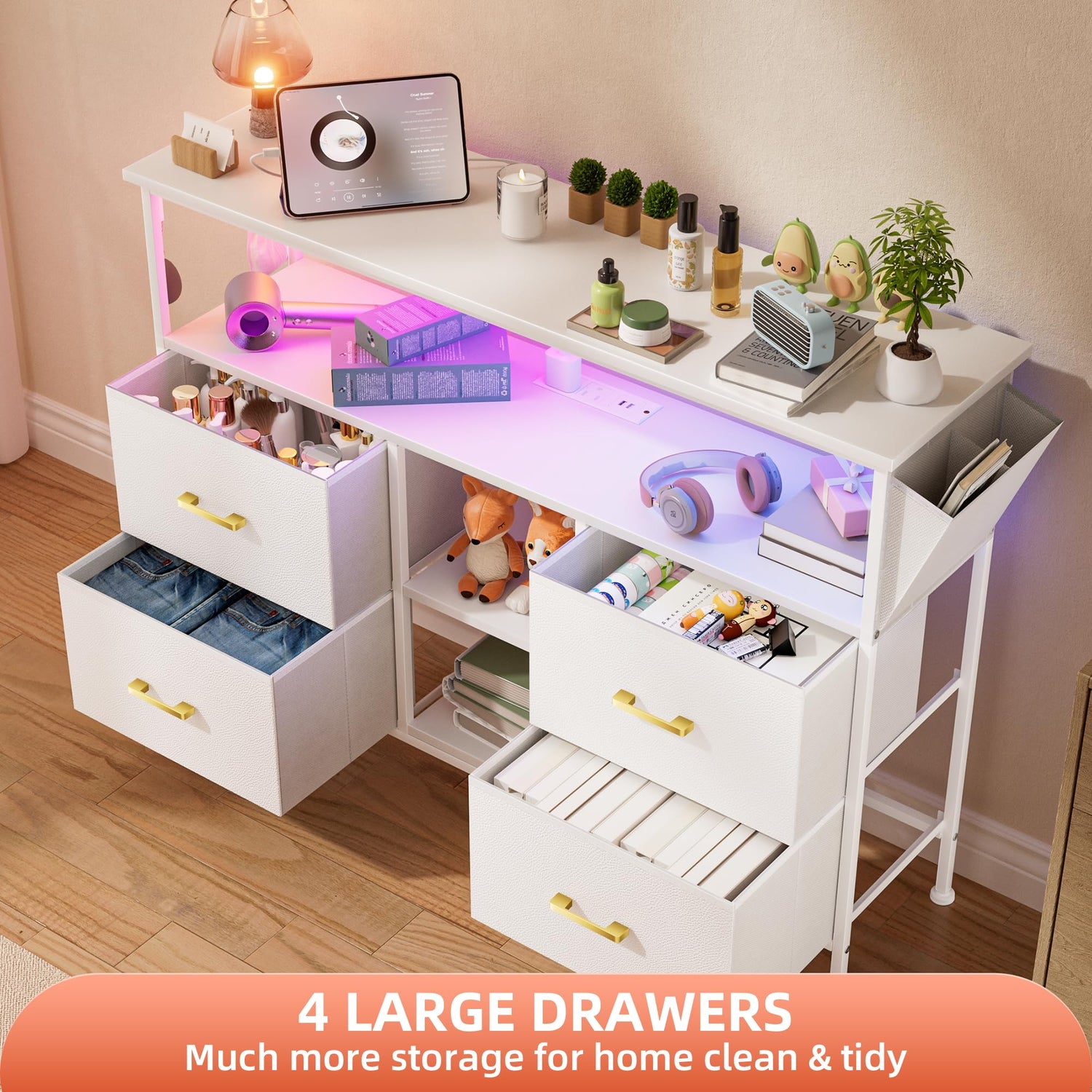 YILQQPER LED TV Stand with Power Outlet for Living Room, TV Media Console for TVs 50 Inch, Modern Dresser TV Stand with 4 Fabric Drawers & Shelves, Media Entertainment Center for Bedroom, White
