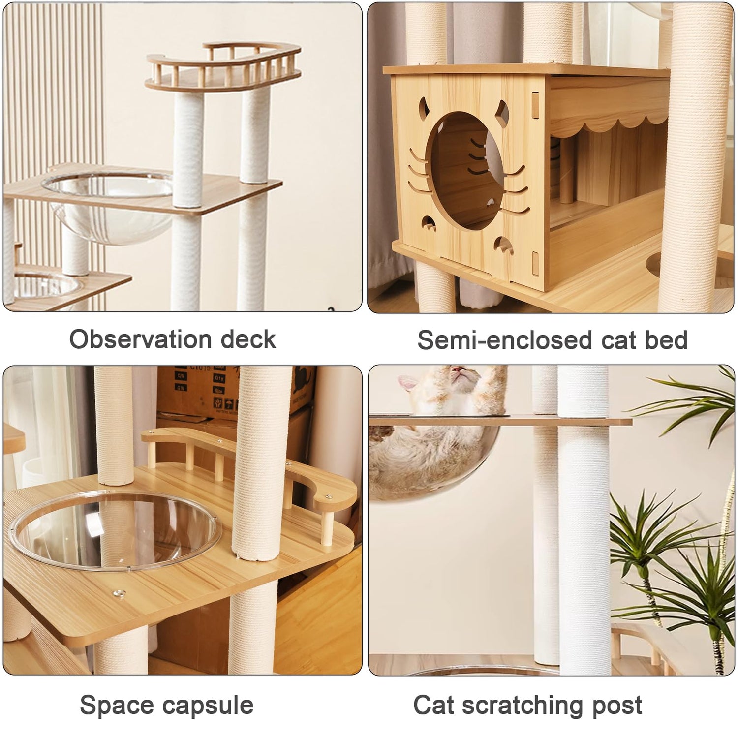 - 【Cat Play Area】The cat tower with scratching post is a play area that combines entertainment, exercise, and rest. It features relaxing spaces such as a wooden observation deck, a hideaway, and a spaceship with a transparent 360-degree view. In the transparent spaceship, you can watch cute cats playing happily. There are also multiple heavy-duty scratching poles so your kitty can sharpen her nails.