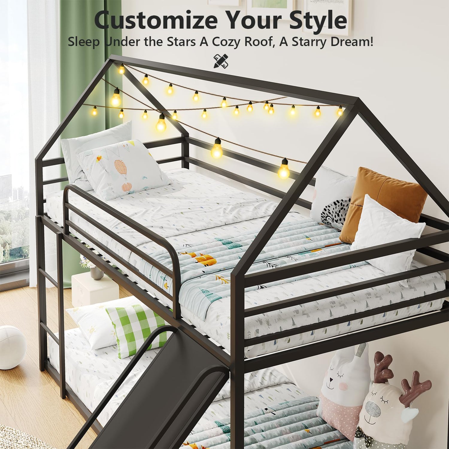 - Plenty of storage space: Twin over twin two layers bunk bed with slide, gives you more happy time when sleeping together with brothers, sisters and/or friends, ladder and slide on both ends of one side of the house bed, it is chasing playtime before sleeping.The low-to-the-ground design inspired by Montessori principles provides easy and safe access for children.