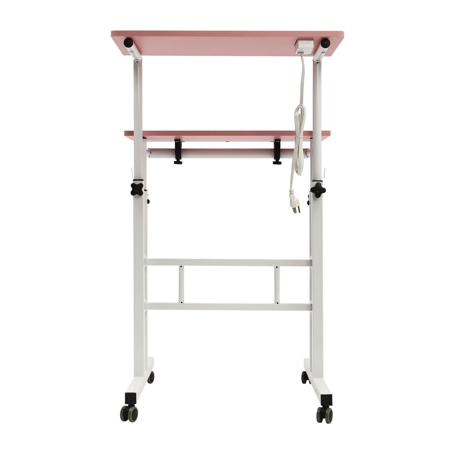 YIPONYT Mobile Standing Desk with 2 USB Ports and Outlets, Adjustable Standing Computer Desk, Standing Adjustable Laptop Cart with Wheels, Rolling Desk Laptop Cart (Pink)