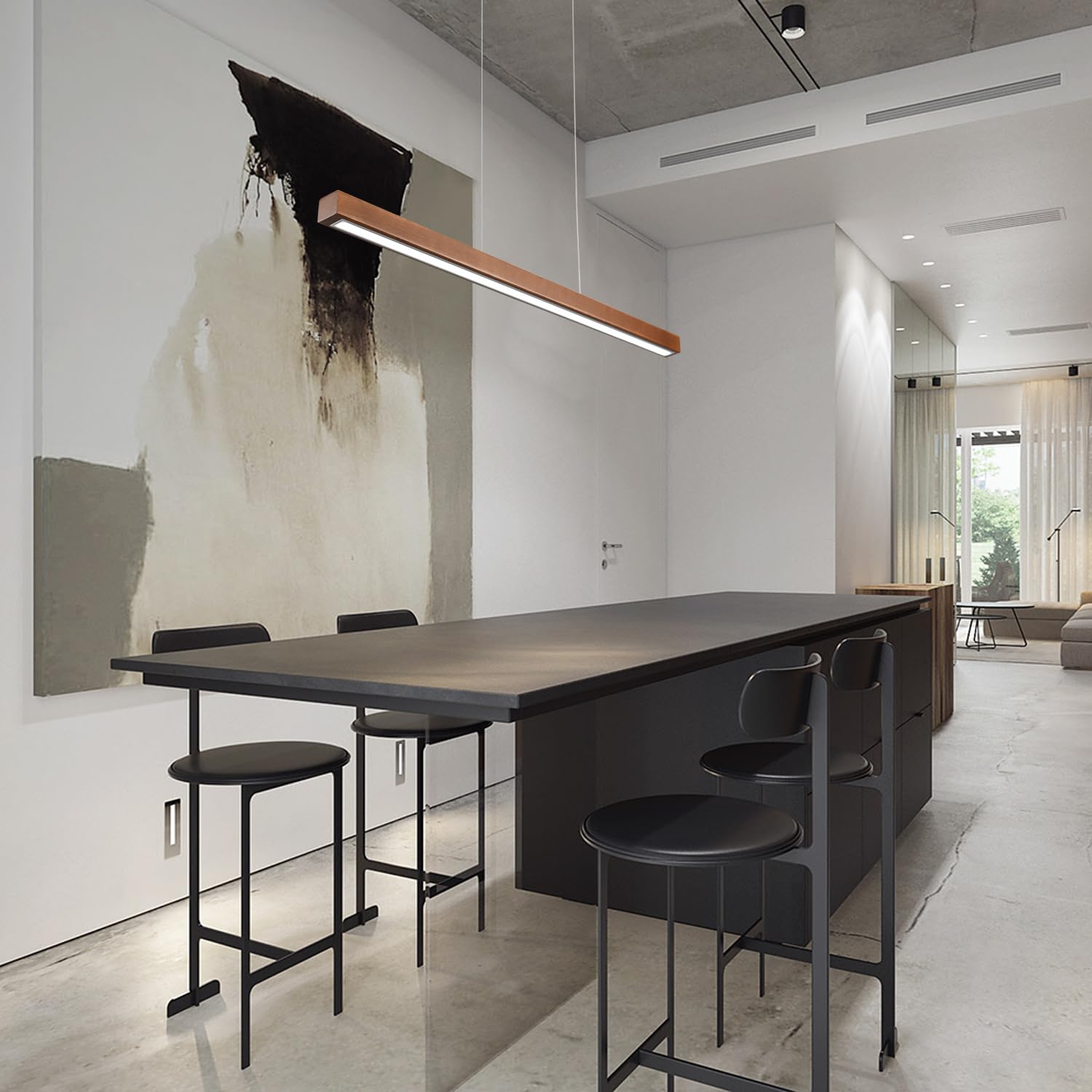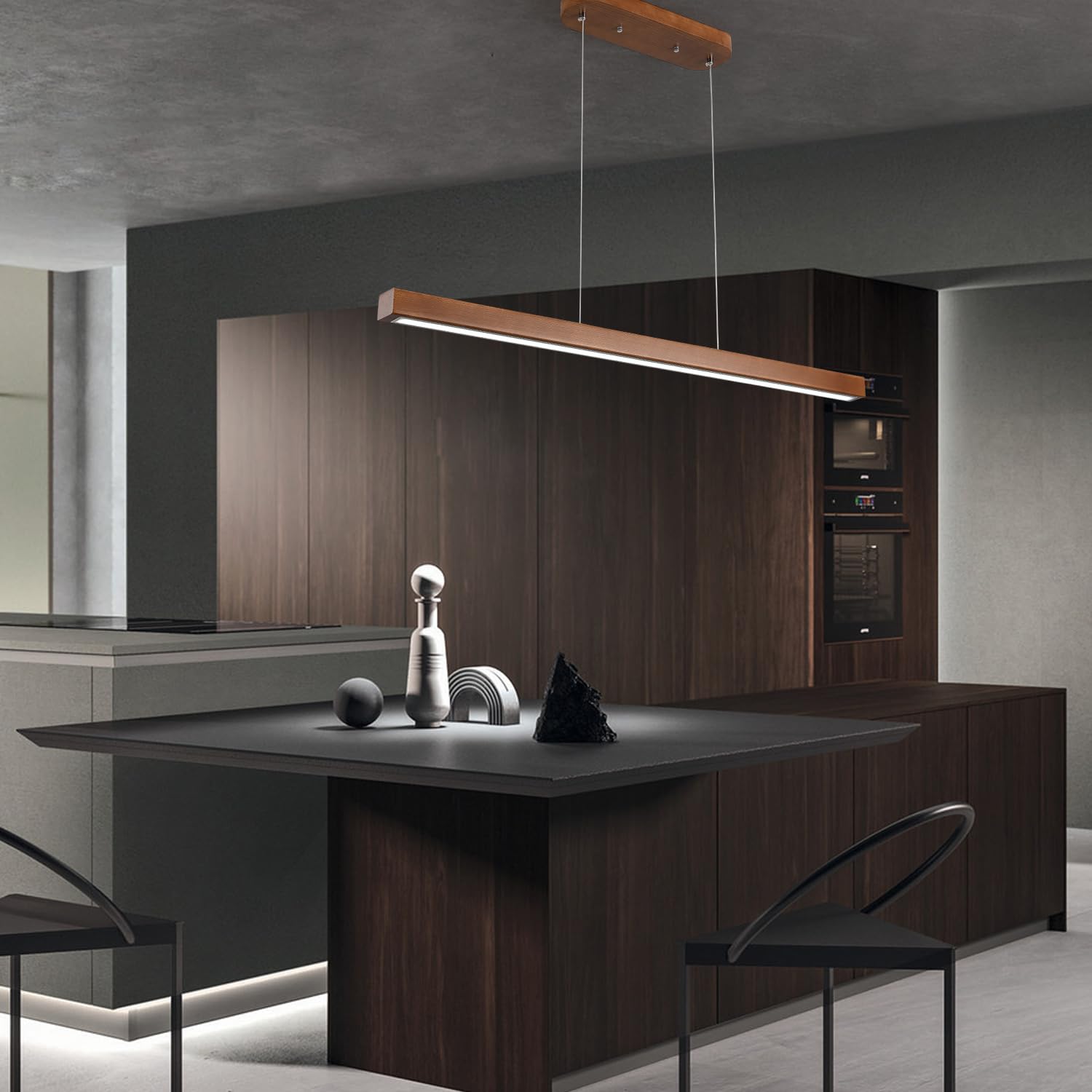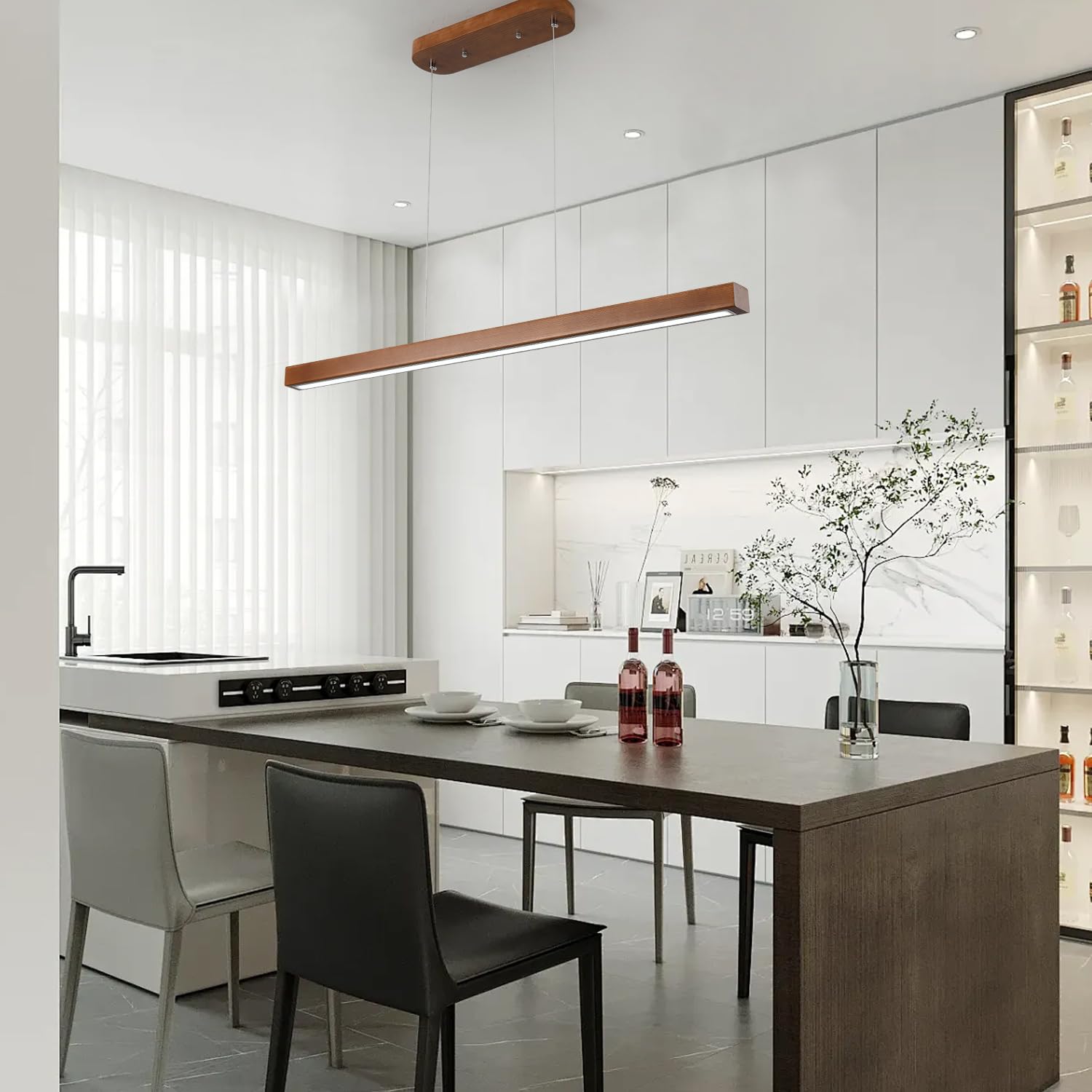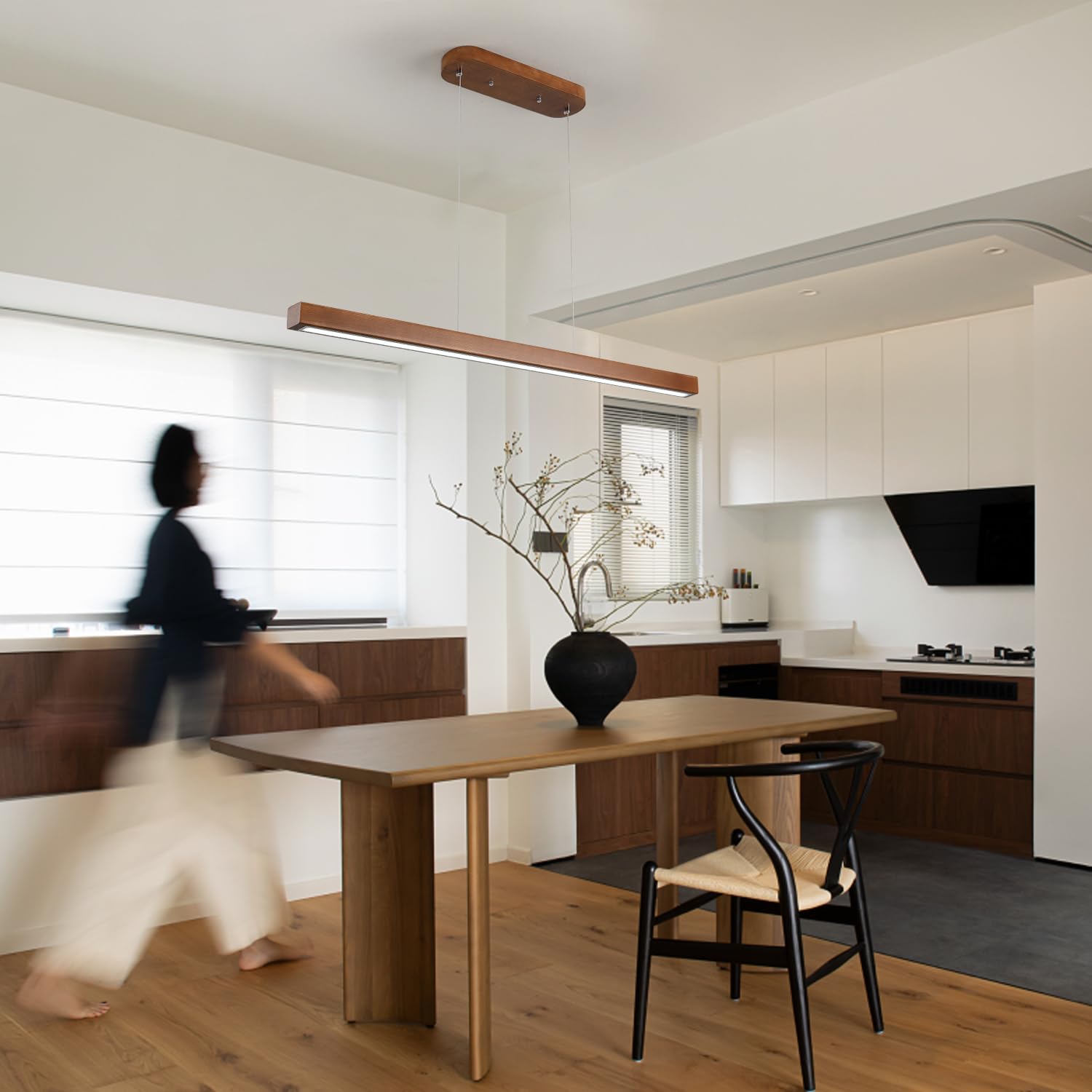 - 【39inches Linear Pendant Light】The real wood finishes and dramatic presence of LED light elevate your environment symmetrically and stylishly above elements like a dining table or kitchen island.This sleek design illuminating the space with a single long rail powered with state of the art LED technology. The rest of the piece is kept simple, hung with cables from a matching rectangular canopy.Making your cooking and dining experiences more intimate with upscale lighting from the 39" Linear LED Pendant.