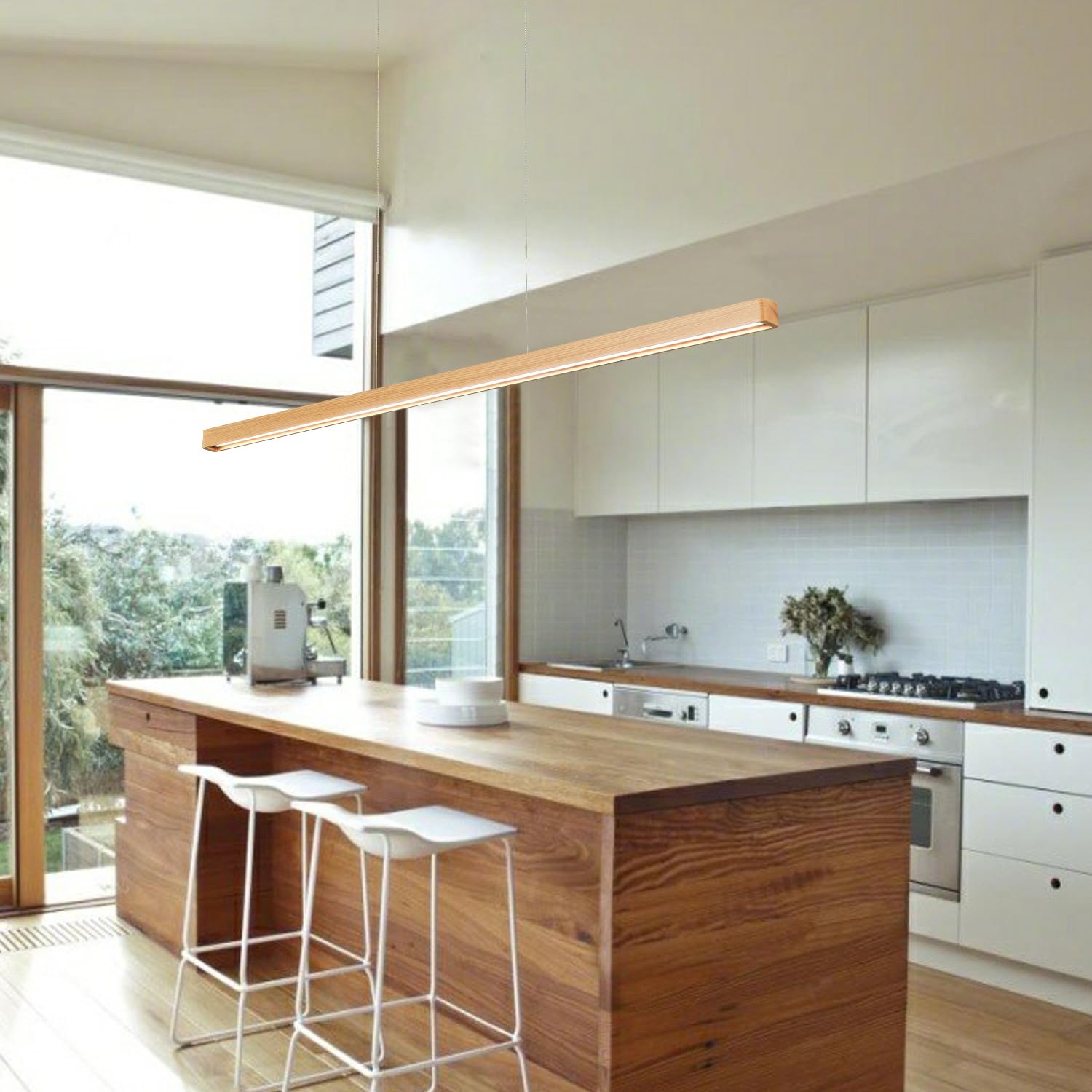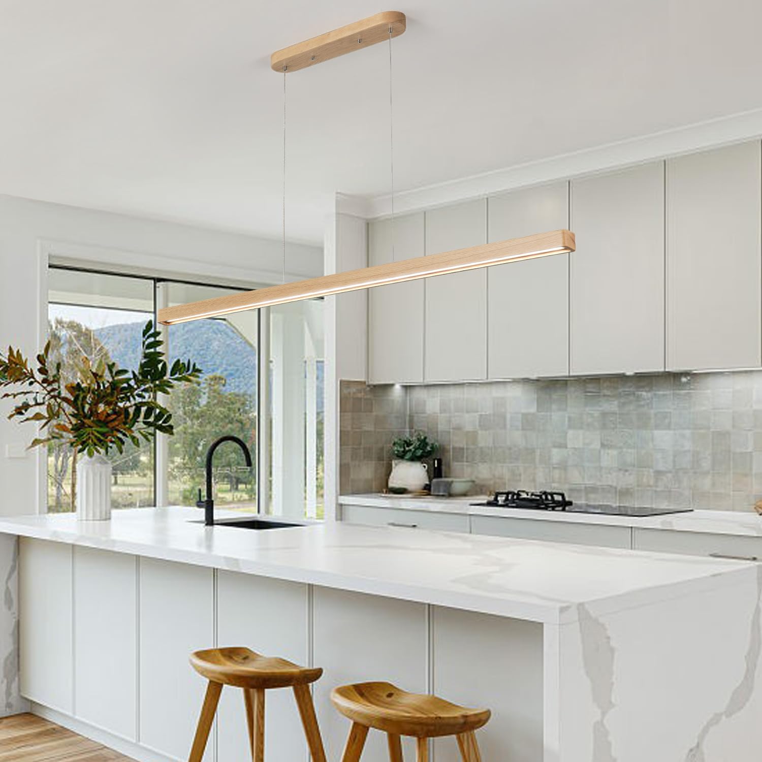 - 【Dimmable Natural Wood Ceiling pendant light】:This modern pendant light designed with a built-in led engine.the real wood frame and acrylic shade make this fixture tailor-made for a modern design scheme.use this hanging linear pendant light to add depth and warm light to your kitchen and dining room space. whole 40 watt (cri>90) energy-saving led light source,high color rendering restores the true color of food, making the food on the table more delicious and more appetizing.2762 lumen,remote controls color temperature and brightness,meet your different scene lighting needs.