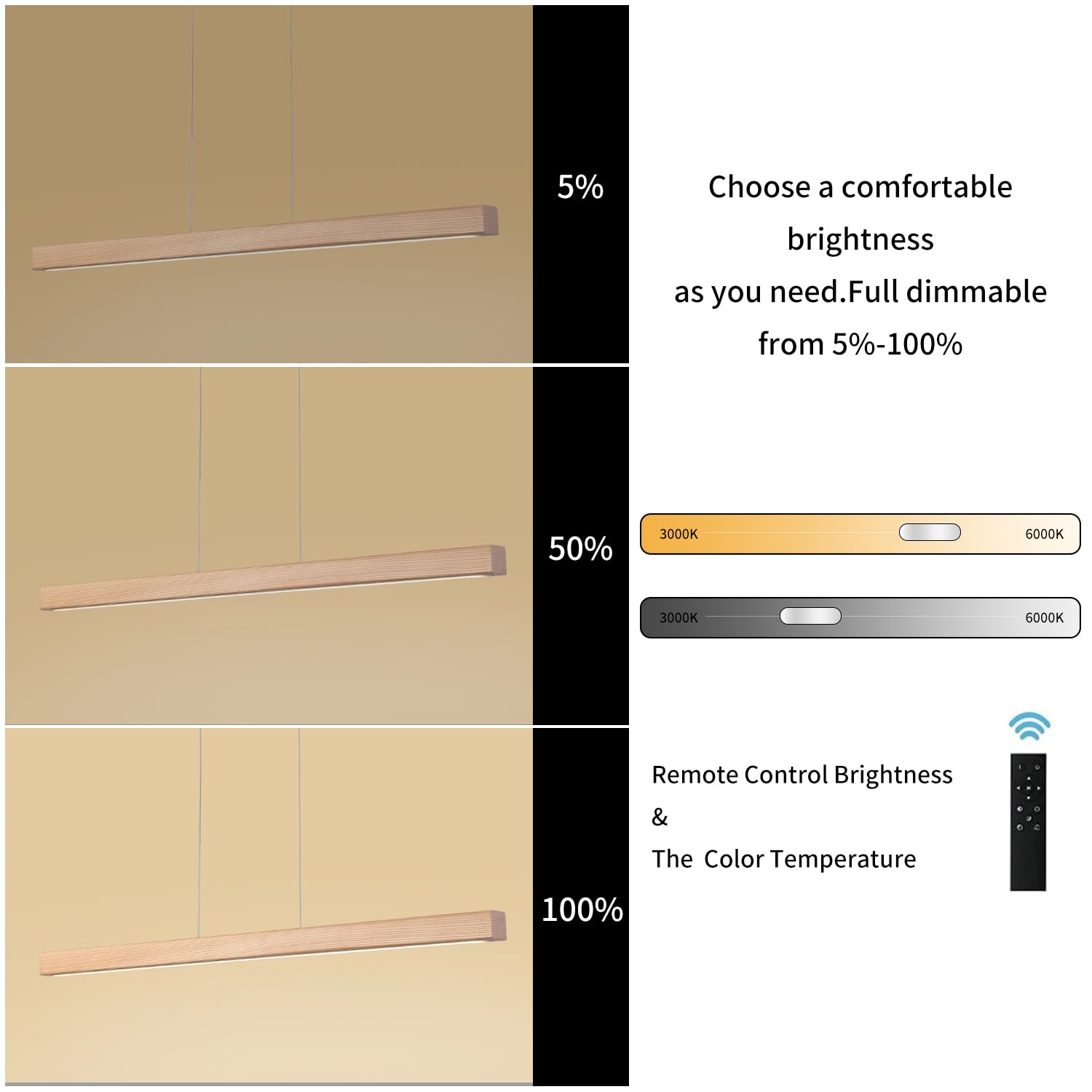 • 【Fully Dimmable Modern Pendant Light】:This modern pendant light designed with a built-in led engine.The real wood frame and acrylic shade make this fixture tailor-made for a modern design scheme.Use this hanging linear pendant light to add depth and warm light to your kitchen and dining room space. Whole 50 watt (cri>90) energy-saving led light source,high color rendering restores the true color of food, making the food on the table more delicious and more appetizing.2762 lumen,remote controls color temperature and brightness,meet your different scene lighting needs