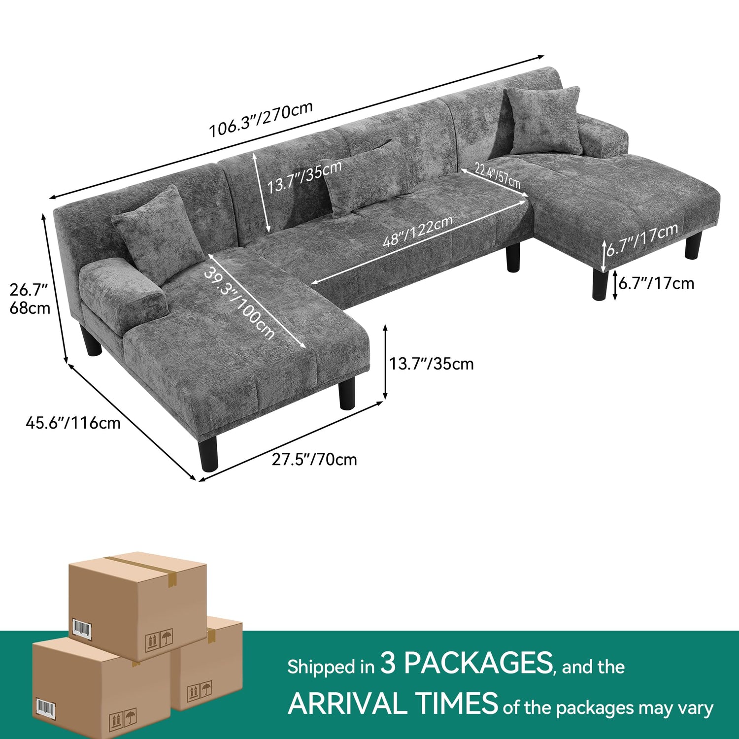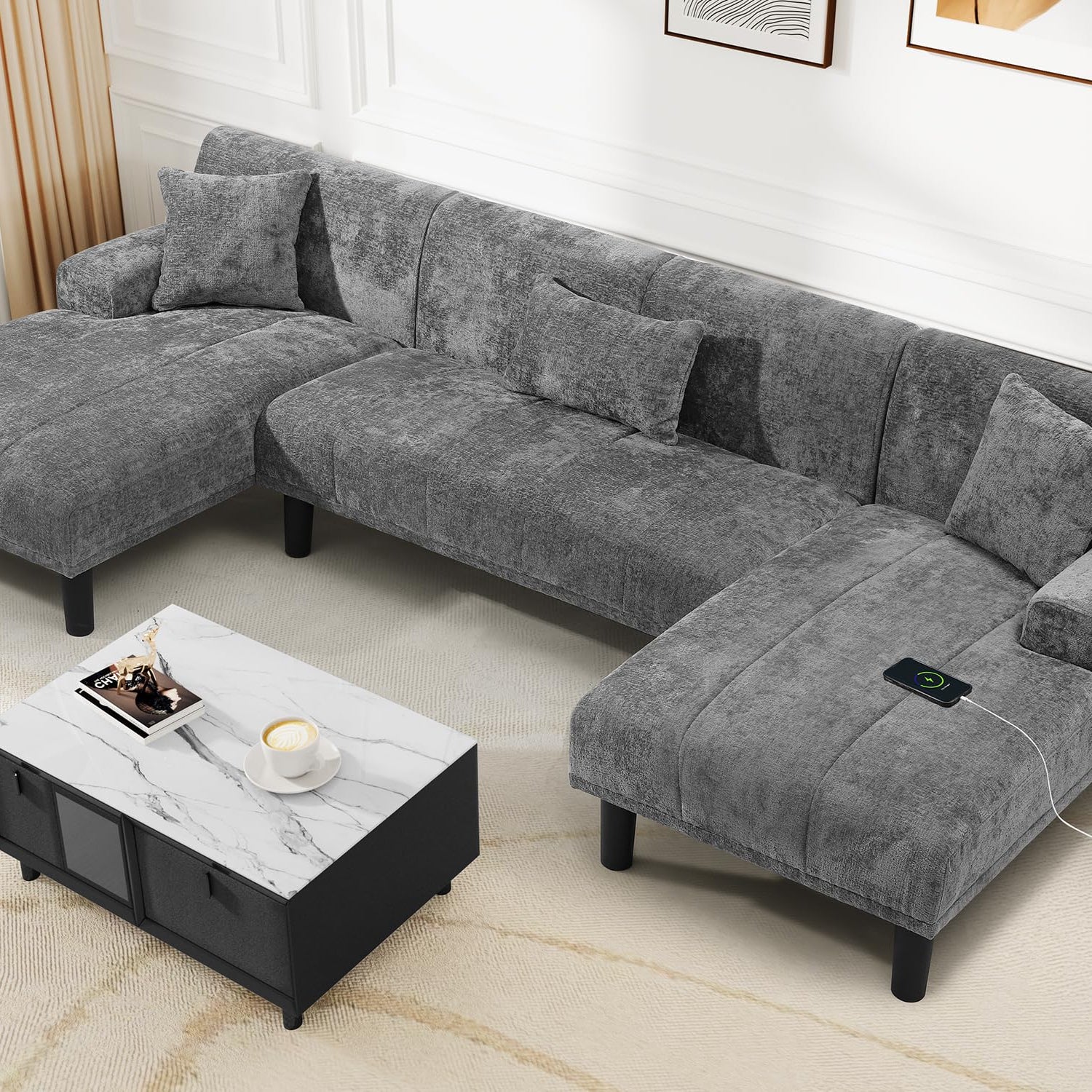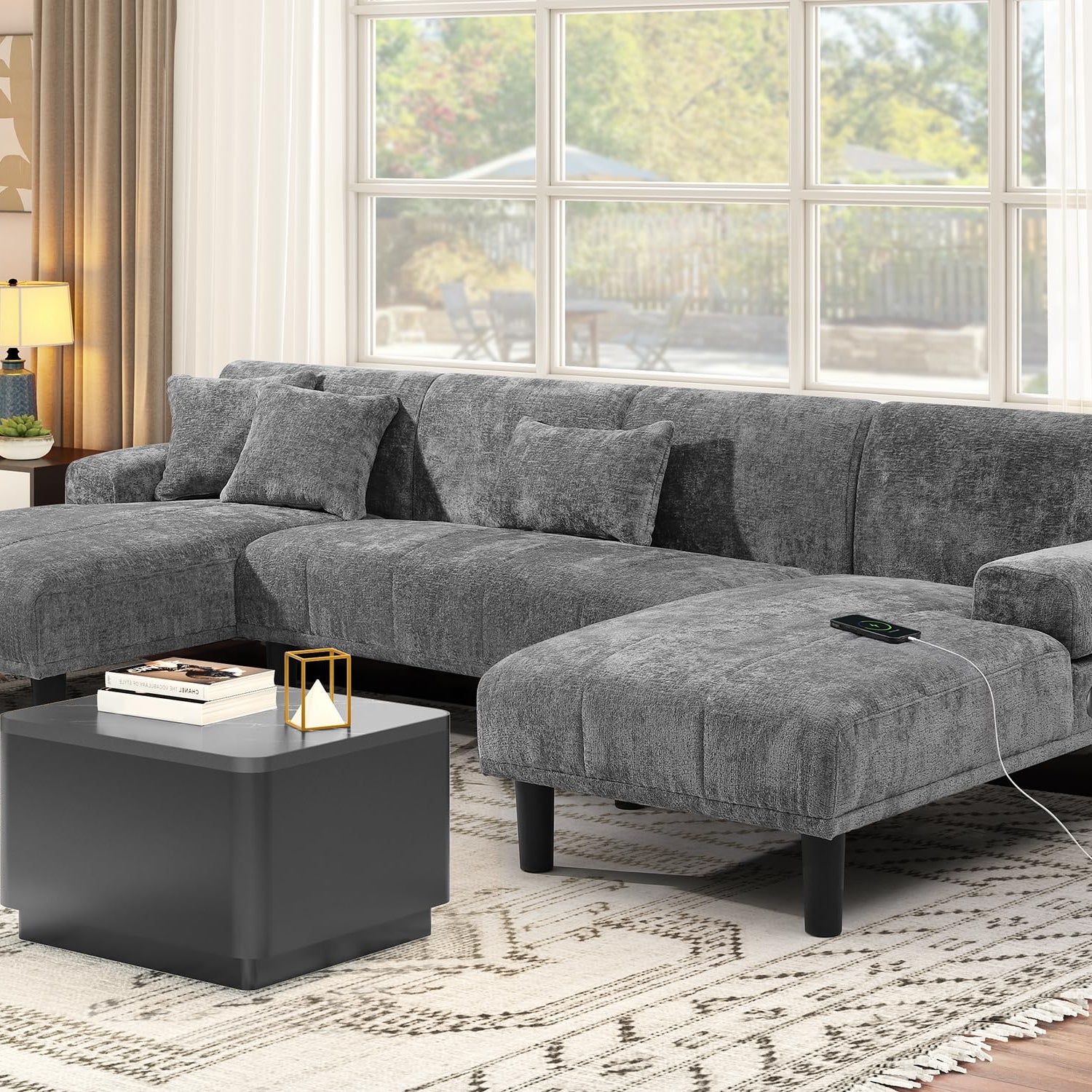 YITAHOMA Sectional Couches for Living Room, U Shaped Sofa Chenille Modern Couch with USB & Type C Charging Ports Double Chaise and Comfy Upholstered, Dark Grey