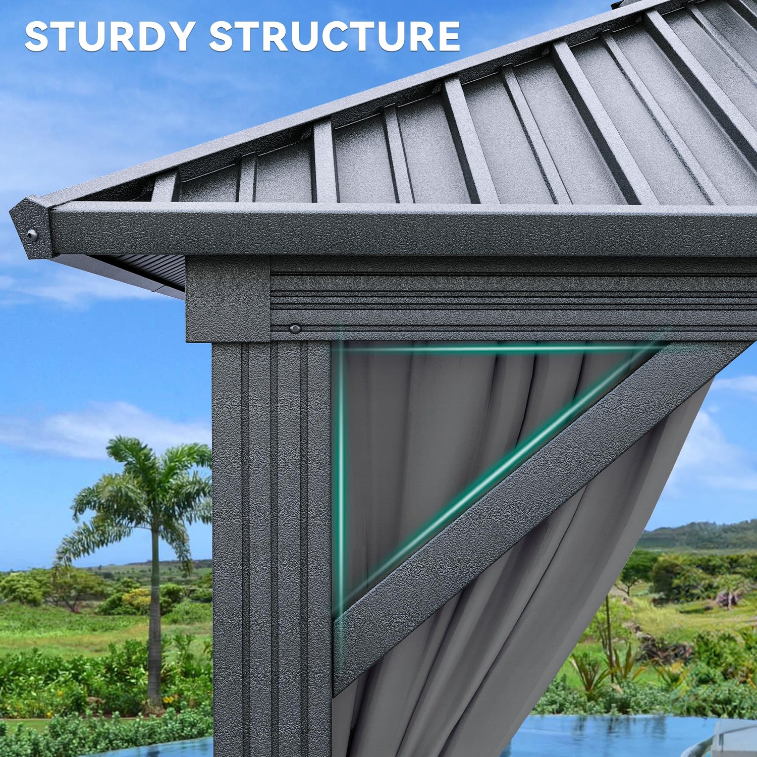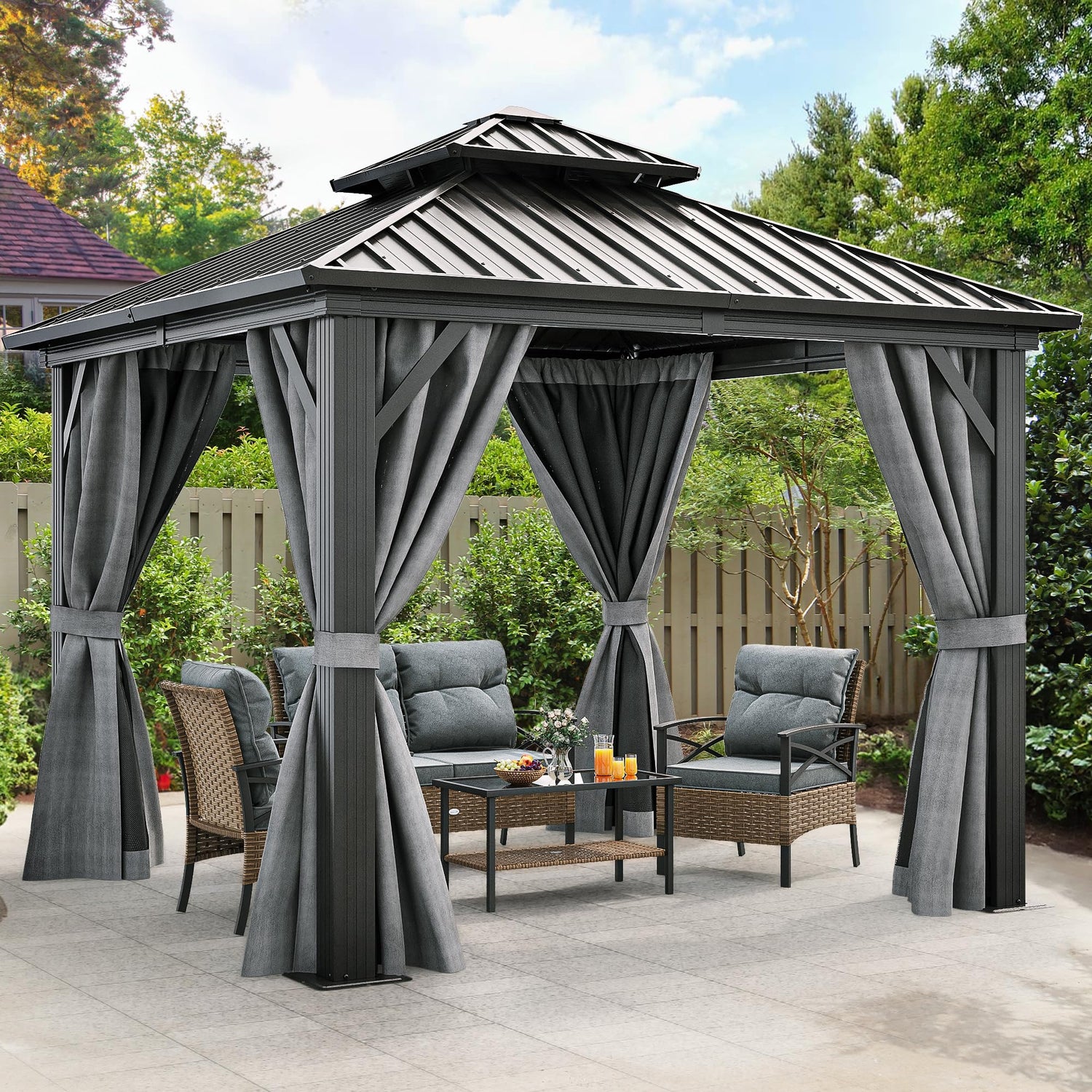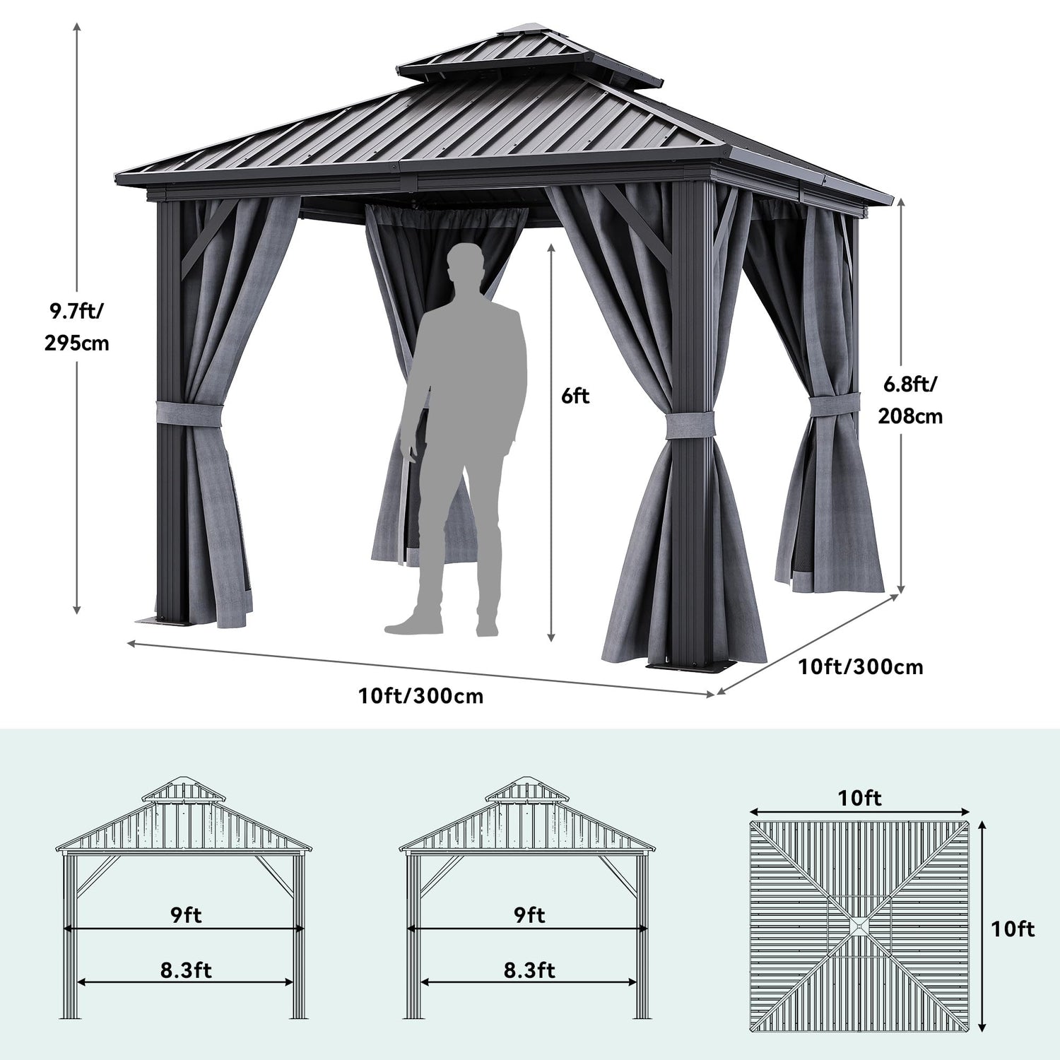 - DOUBLE LAYERED SIDEWALL- Hardtop gazebo features fully enclosed double-sided zipper, double trail system and double layer sidewall. Polyester cloth and mesh grant good ventilation and an open view, protect you from rain and UV rays while adding more privacy. Provide a safe and comfortable environment for your family and children