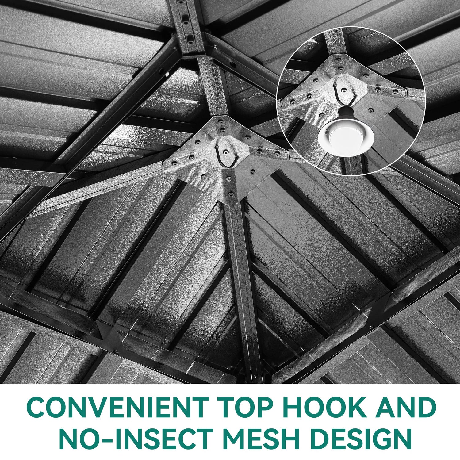 - DOUBLE GALVANIZED IRON TOP- Features a galvanized iron sheet top that prevents fading and prolongs service life. The roof is double top vented for optimum airflow and comfort during periods of strong wind. There is a hook in the middle of the roof, which can be hung with electric lights or fans to boost your pleasant outdoor time