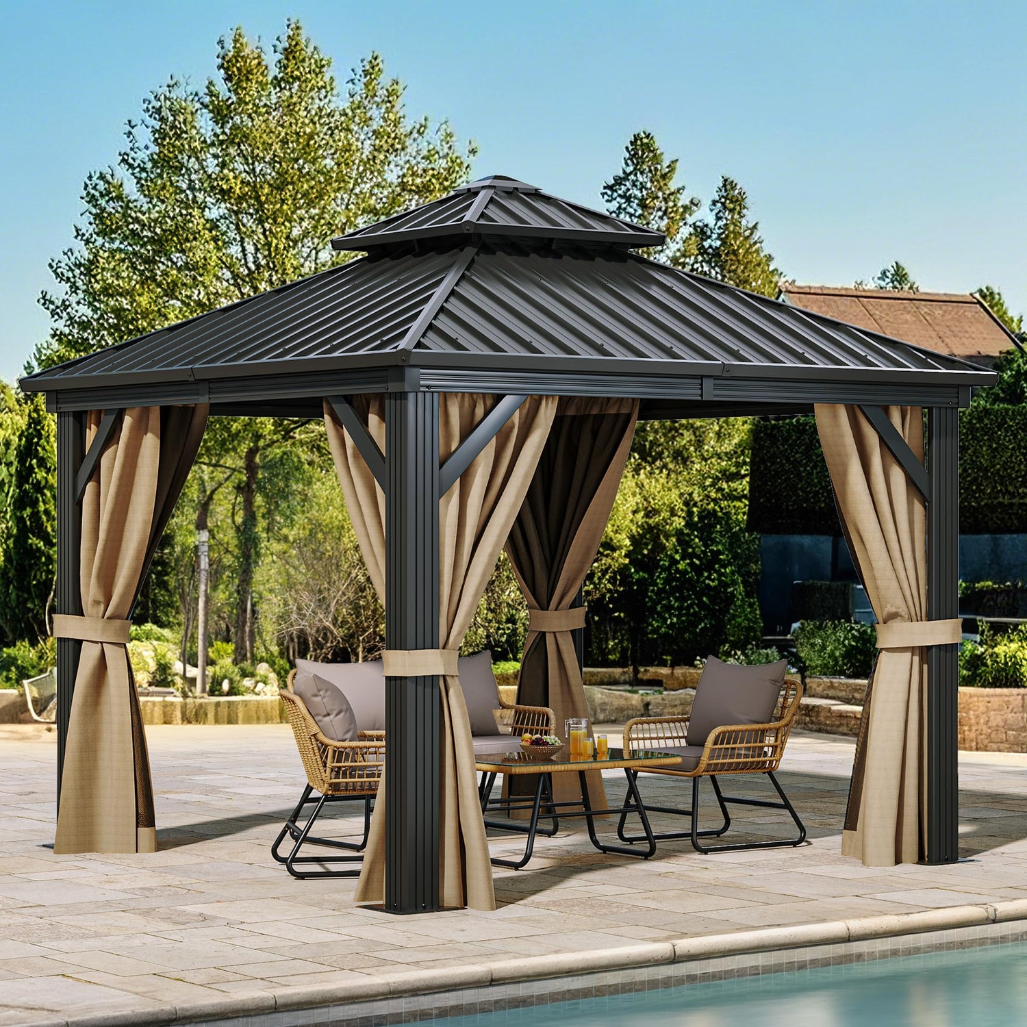 YITAHOME 10X10FT Hard Top Metal Gazebo Patios Double Roof Canopy Aluminum Frame Garden Gzebo Tent Curtains Netting for Patios Backyards Decks Lawns Brown