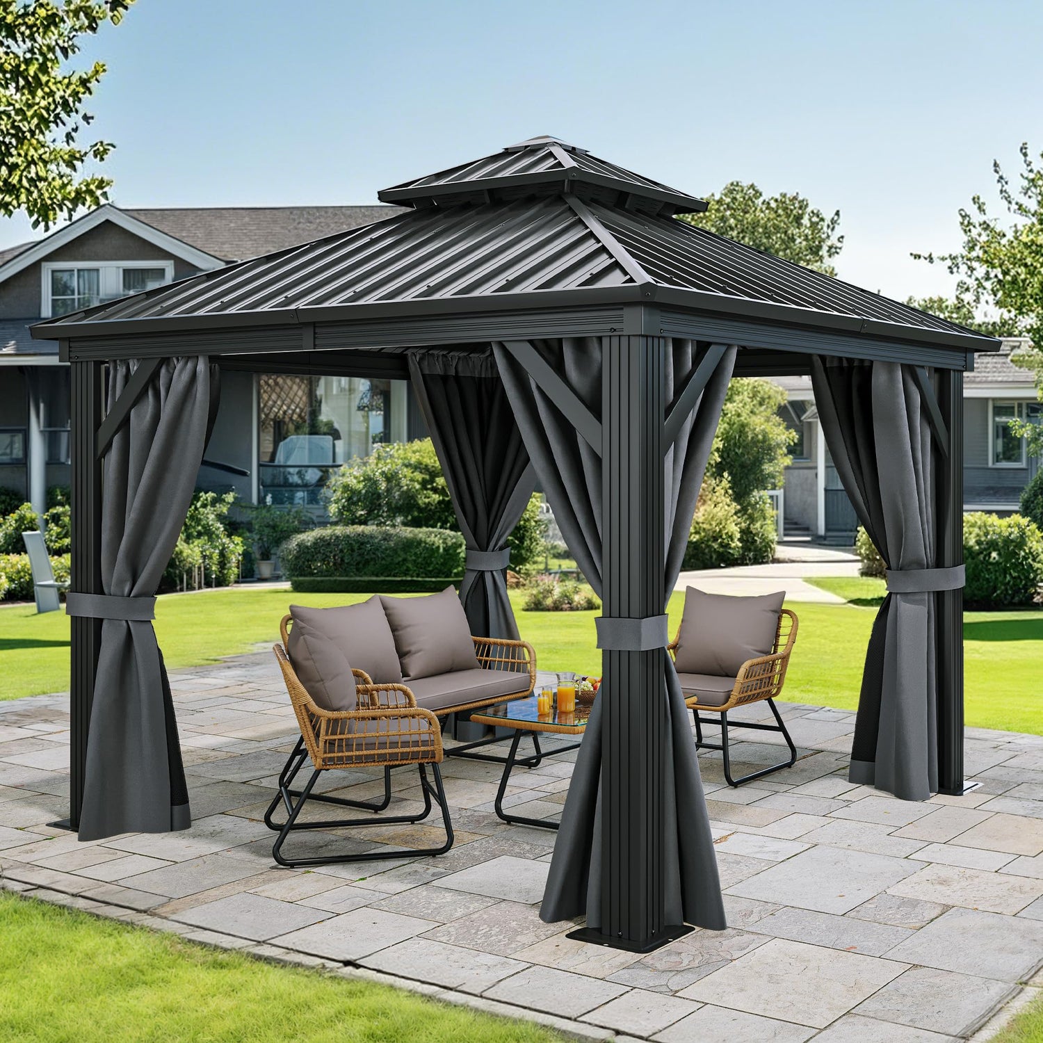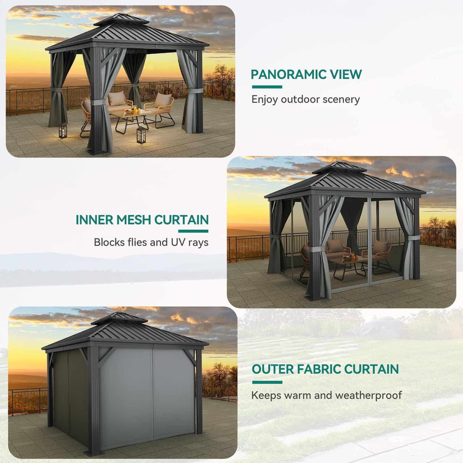 - DOUBLE LAYERED SIDEWALL- Hardtop gazebo features fully enclosed double-sided zipper, double trail system and double layer sidewall. Polyester cloth and mesh grant good ventilation and an open view, protect you from rain and UV rays while adding more privacy. Provide a safe and comfortable environment for your family and children