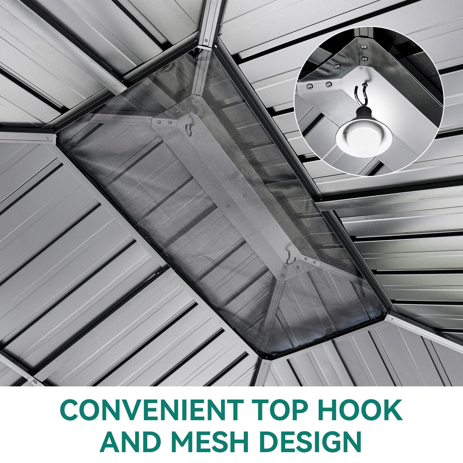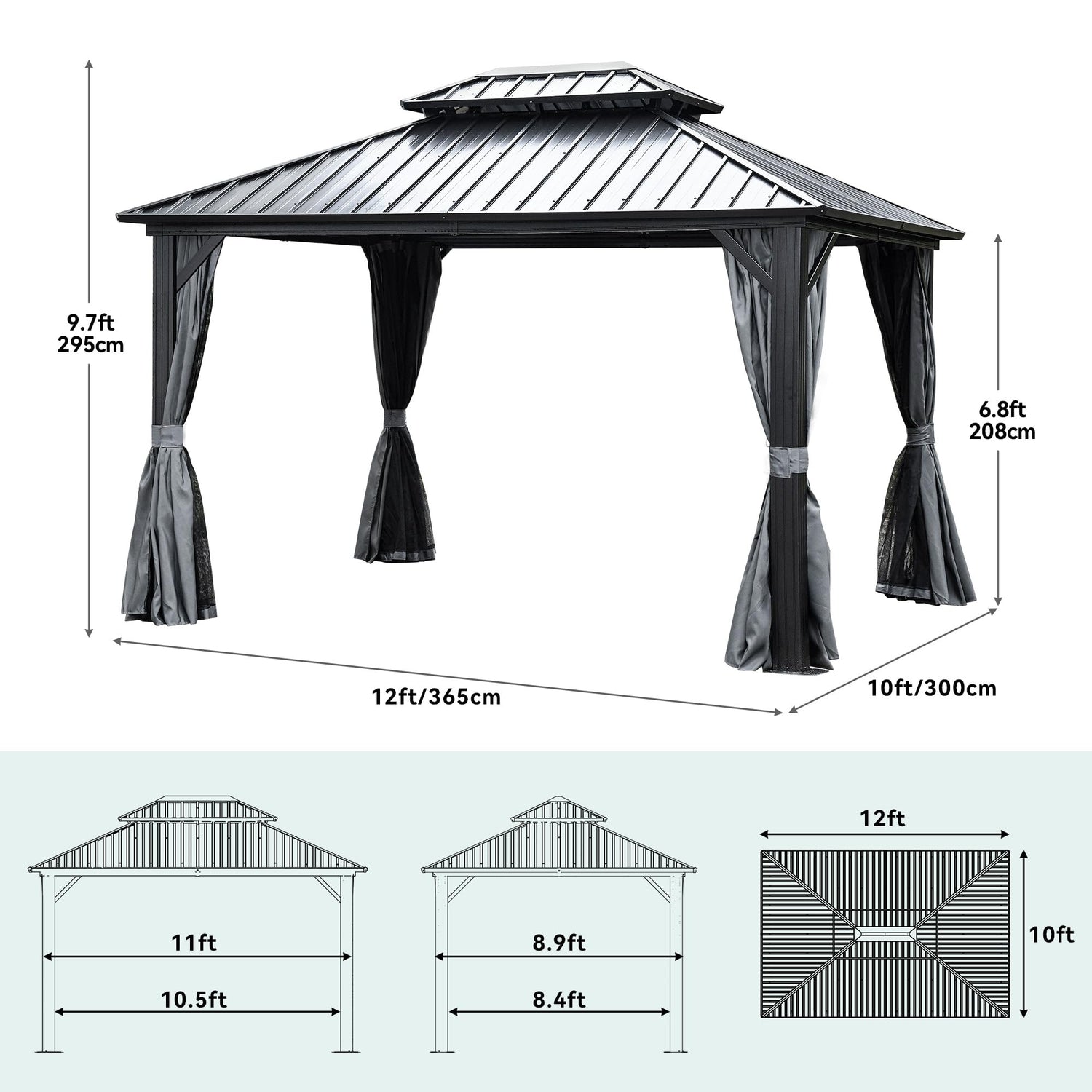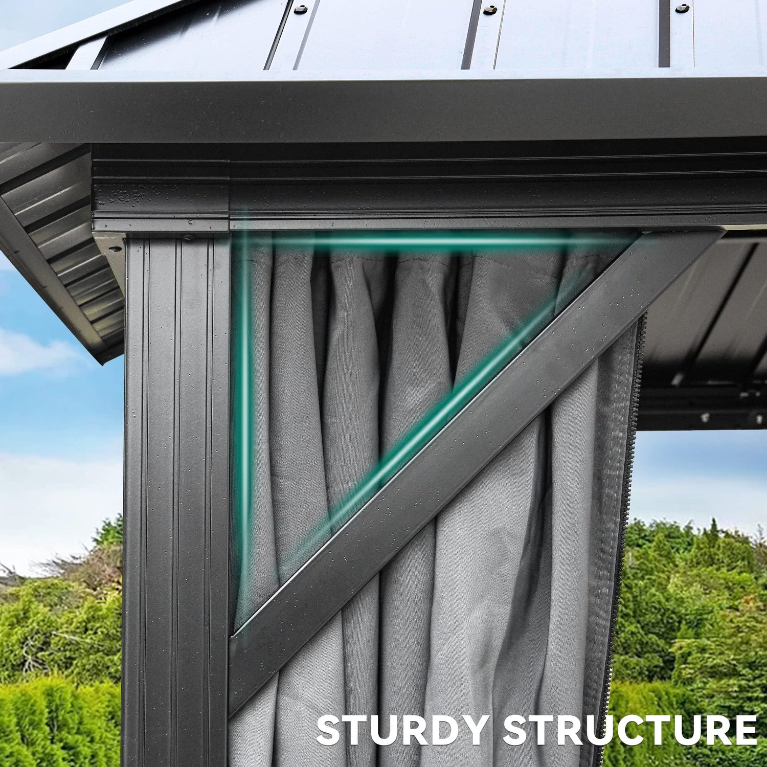 - DOUBLE LAYERED SIDEWALL- Hardtop gazebo features fully enclosed double-sided zipper, double trail system and double layer sidewall. Grey polyester cloth and black mesh grant good ventilation and an open view, protect you from rain and UV rays while adding more privacy. Provide a safe and comfortable environment for your family and children