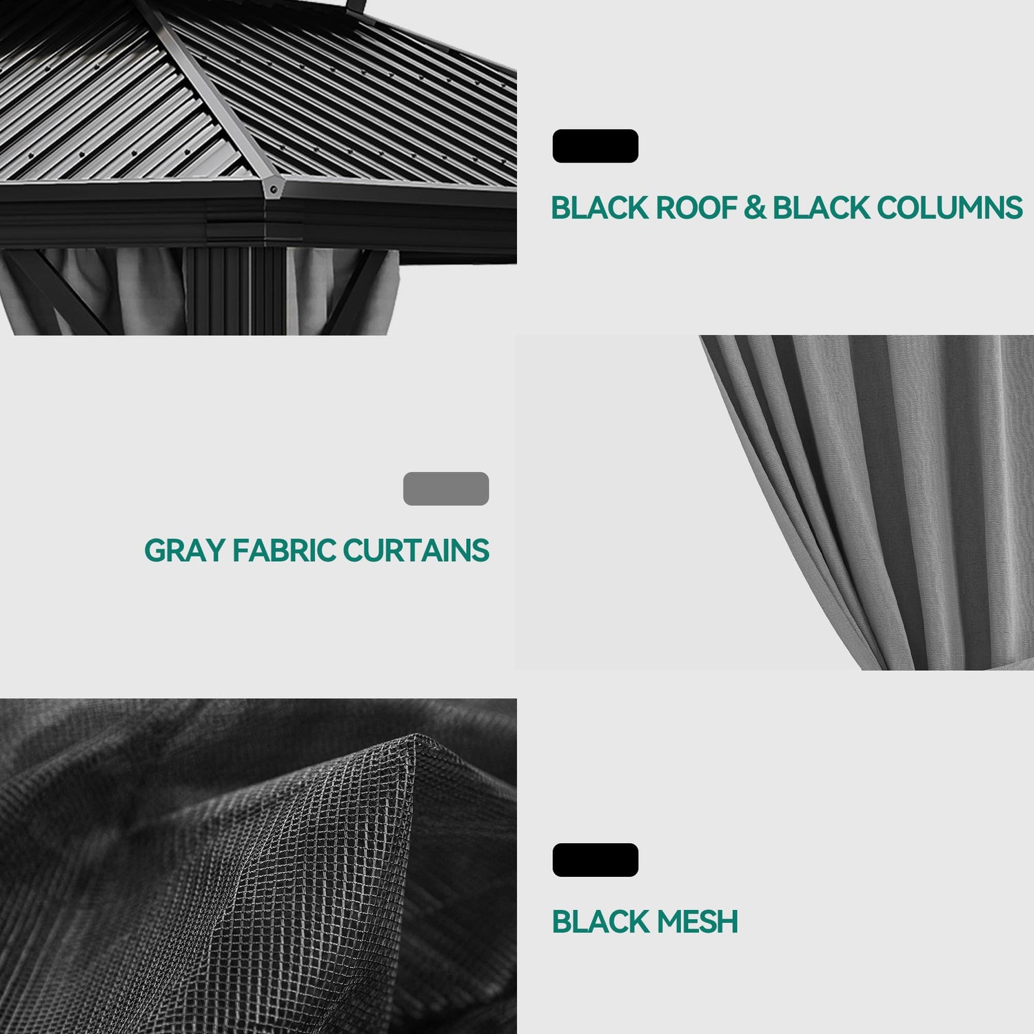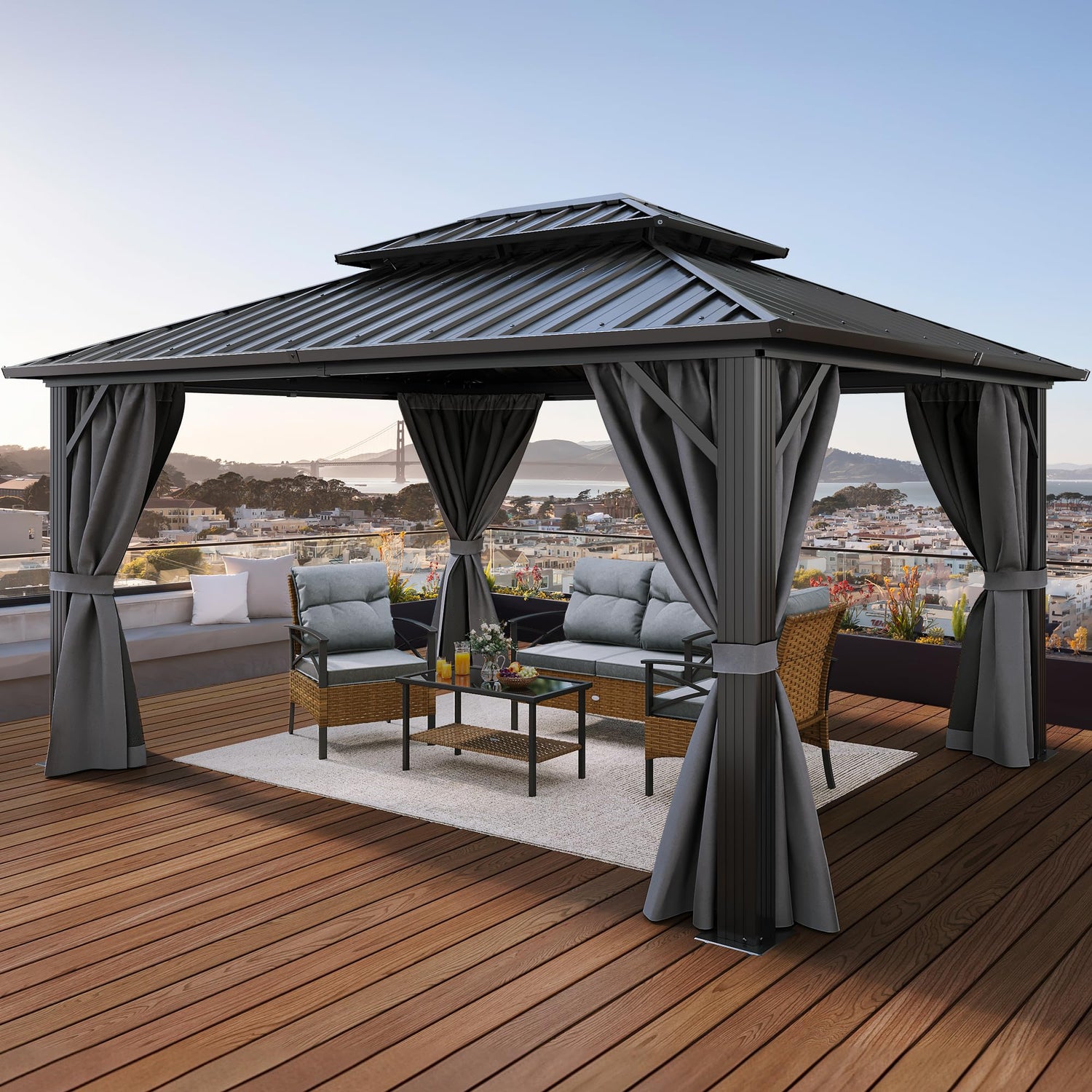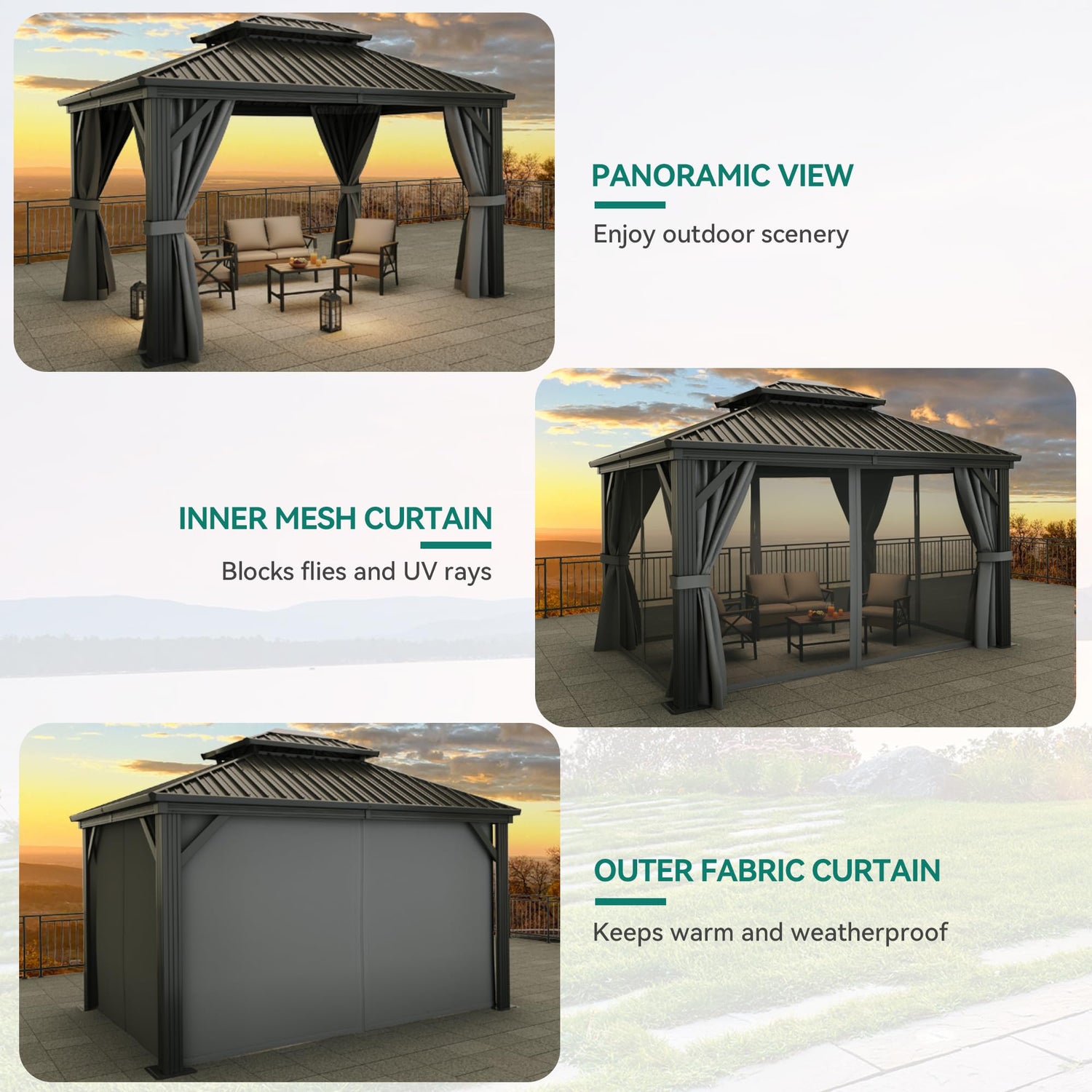 - DOUBLE LAYERED SIDEWALL- Hardtop gazebo features fully enclosed double-sided zipper, double trail system and double layer sidewall. Grey polyester cloth and black mesh grant good ventilation and an open view; protect you from rain and UV rays while adding more privacy. Provide a safe and comfortable environment for your family and children