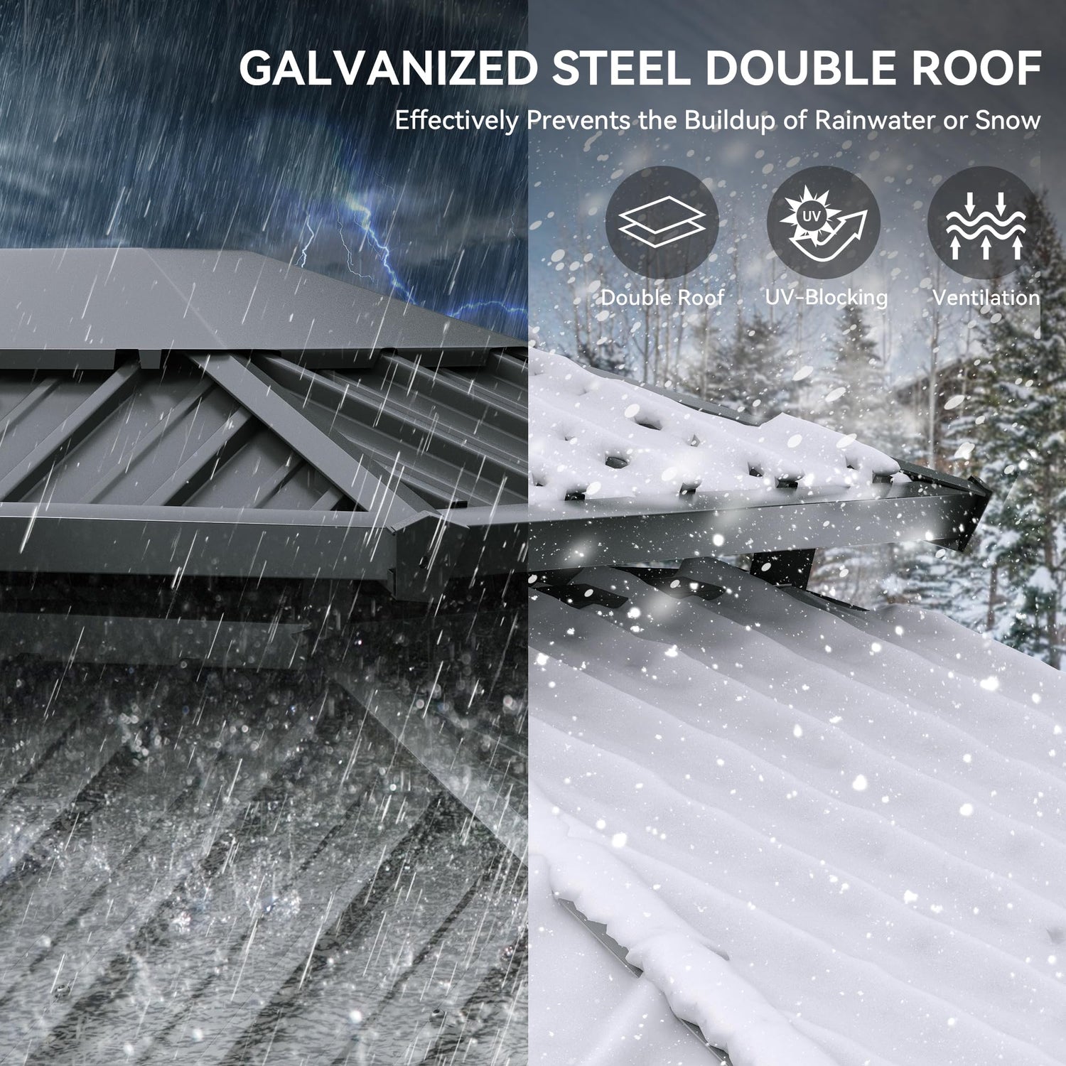 - DOUBLE GALVANIZED IRON TOP- Features a galvanized iron sheet top that prevents fading and prolongs service life. The roof is double top vented for optimum airflow and comfort during periods of strong wind. The middle of roof has two hooks that can be hung with electric lights or fans to boost your pleasant outdoor time