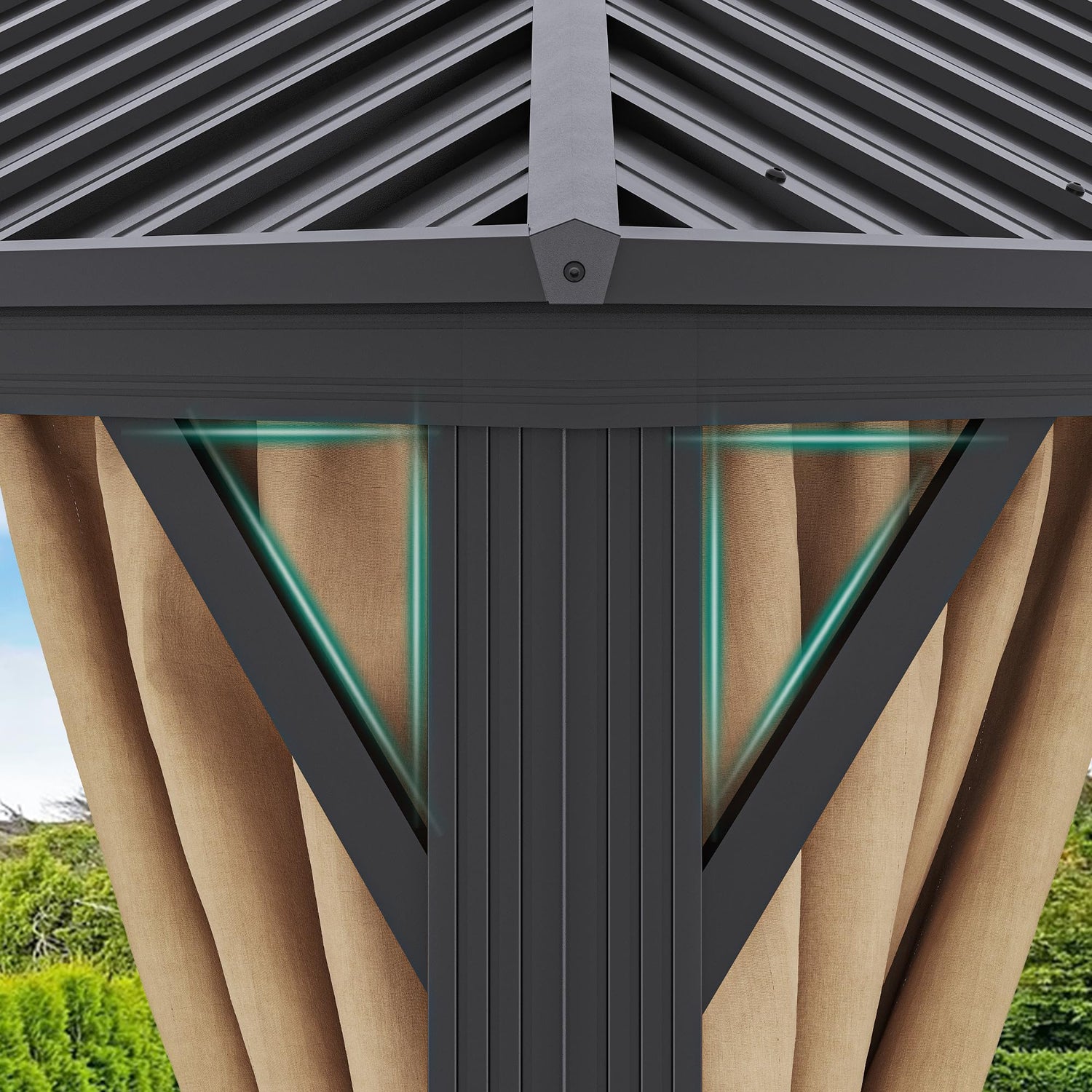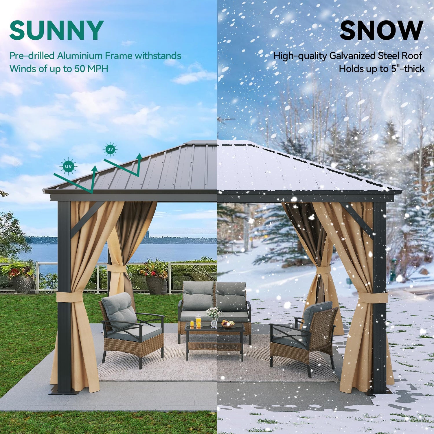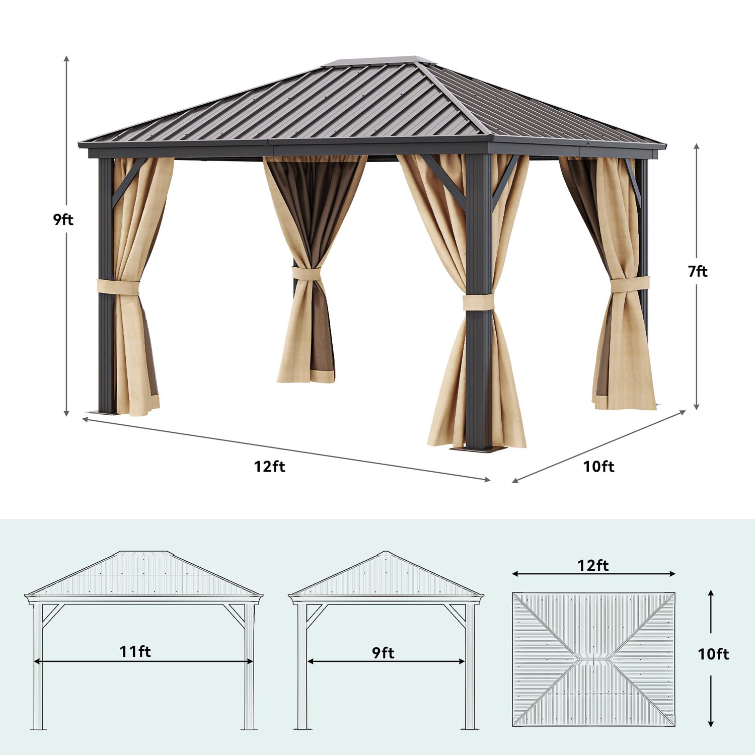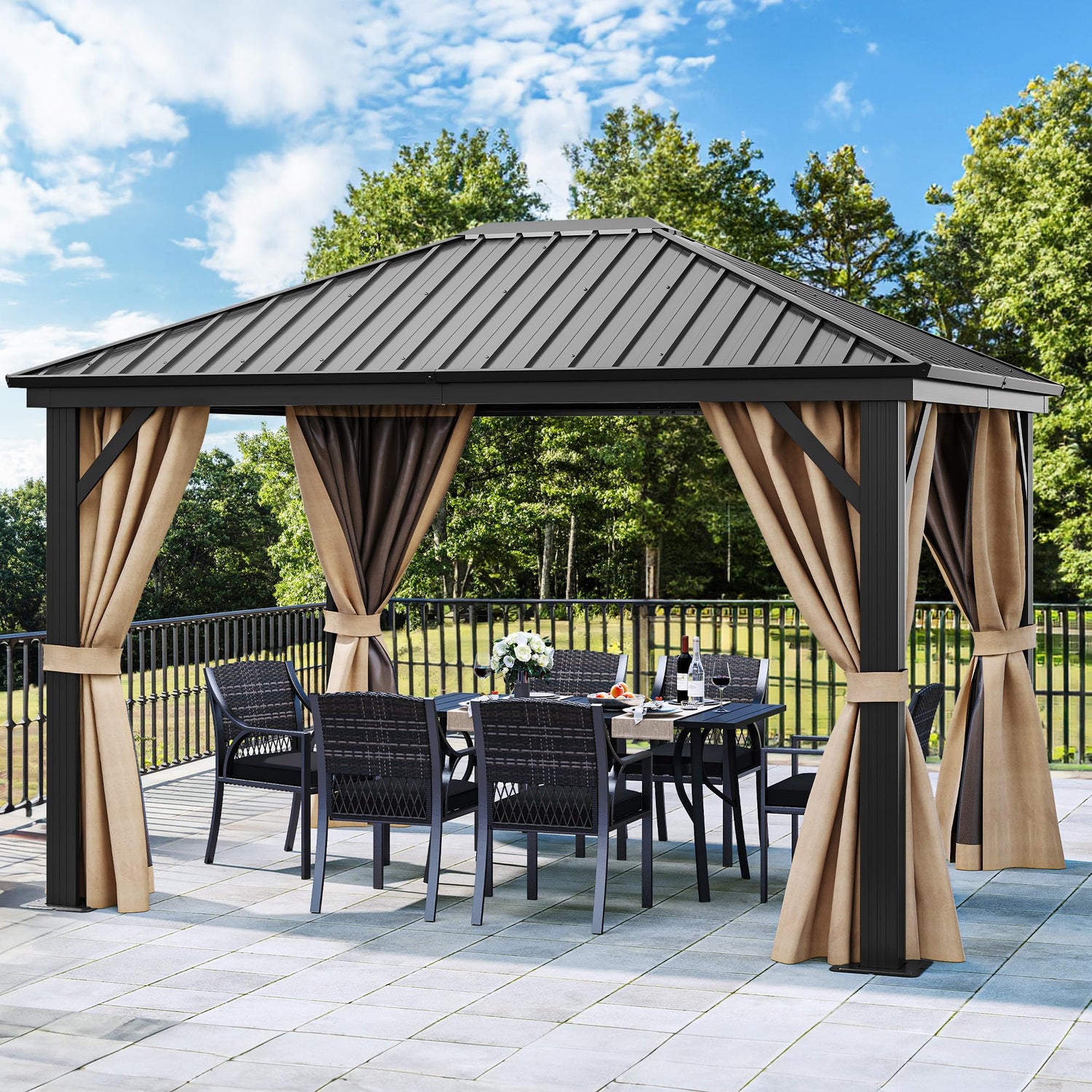 - DOUBLE LAYERED SIDEWALL- Hardtop gazebo features fully enclosed double-sided zipper, double trail system and double layer sidewall. Polyester cloth and mesh grant good ventilation and an open view; protect you from rain and UV rays while adding more privacy. Provide a safe and comfortable environment for your family and children