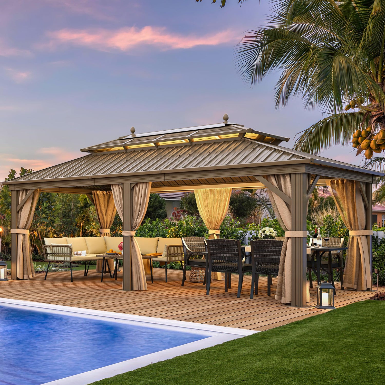 Details: DOUBLE COMBINED ROOF- The roof of the gazebo combined by small horizontal stripes top and large vertical stripes top; Features a galvanized iron sheet top that prevents fading and prolongs service life. The roof is double top vented for optimum airflow and comfort during periods of strong wind. The middle of roof has 3 hooks that can be hung with electric lights or fans to boost your pleasant outdoor time DOUBLE LAYERED SIDEWALL- Features fully enclosed double-sided zipper, double trail system and double layer sidewall. The polyester cloth and mesh grant you good ventilation and an open view; protects against insects, rain and UV rays while adding more privacy; a safe and comfortable environment for your family STURDY ALUMINUM FRAME- Strong powder coated aluminum frame that’s weather-resistant and prevents fade, rust, and corrosion. The feet contain holes and ground stakes for additional stability, 4 reinforced corners provide extra durability and safety; easy assembly SPACIOUS ROOM- Outdoor canopy gazebo looks great in backyards, terraces, lawns, courtyards and other outdoor spaces; It’s spacious enough to accommodate 10-16 people for parties and weddings; enjoy a relaxing time with your friends and family EASY ASSEMBLY- Comes with detailed tutorial installation videos and manual; Installation will take roughly 6-10 hours and 4-6 people are recommended; YITAHOME has a professional team to support you if you have any questions