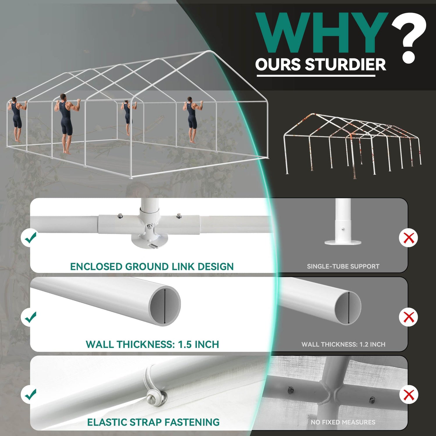 • UPGRADED FRAMEWORK- The high quality, heavy-duty white powder coated galvanized steel structure is rust and corrosion resistant; 1.5-inch (38 mm) steel tube diameter & 1.66-inch (42 mm) metal connector diameter help to provide strong support; Thick base strengthens our gazebo by providing immense stability and durability for outdoor activities