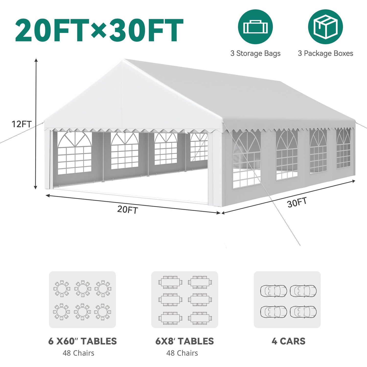 • PACKAGE CONTENTS- Package: 3 boxes; Comes with 1 x top cloth; 2 x sidewalls with windows, 2 x zipper doors, columns, 3 x Oxford cloth storage bags, connecting parts, 8 x 6mm large ground nails, 8 x pull ropes, 20 x small ground nails; Product comes packaged in 3 boxes that might not arrive together; Safety measures and professional installation are highly recommended