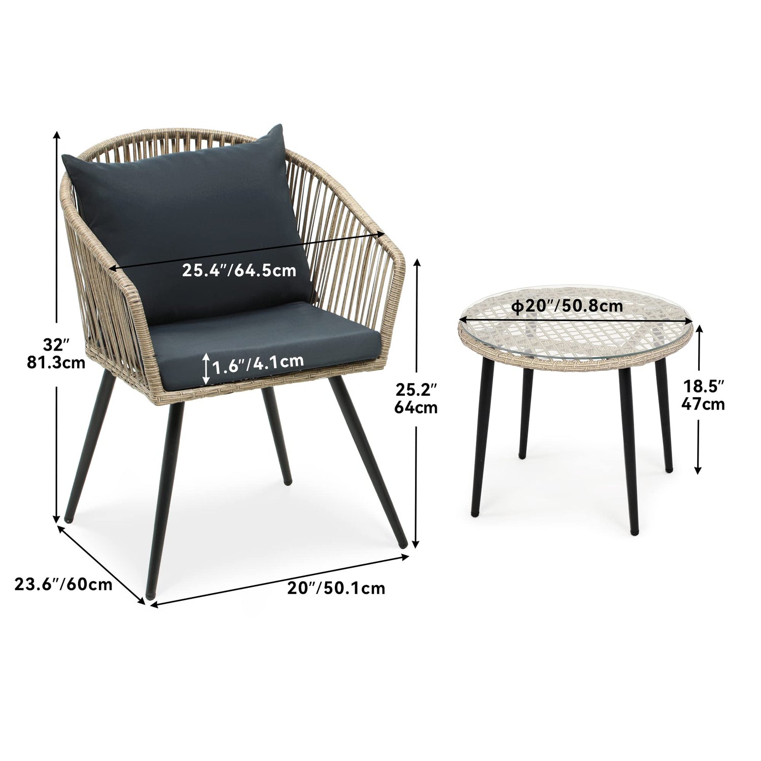 - Easy Installation: Comes with 2 chairs, each with dimensions of 25.6"(L) x 23.6"(W) x 32"(H), and 1 coffee table measuring 20"(Dia) x 18.5"(H); Total weight is 36 pounds; Convenient assembly only takes a few minutes by following the instructions with all parts included