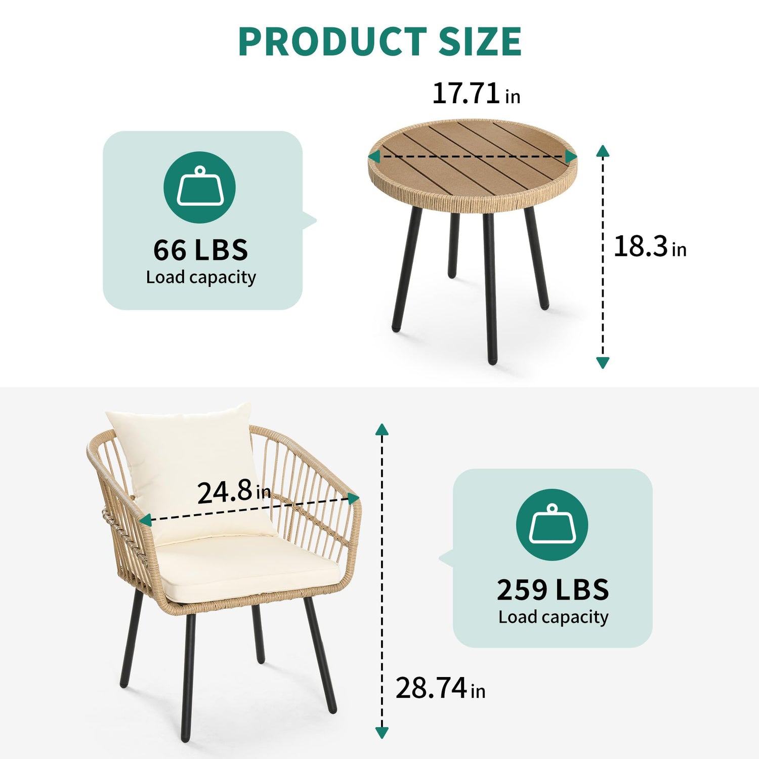 - Dimension & Package List: This outdoor garden furniture set includes 2 high-back armchair, 2 seat cushions, 2 fluffy back cushions, and 1 round coffee table. Chair size: 24.8" x 25.2" x 28.7", Table size: 18.1" x 17.7"