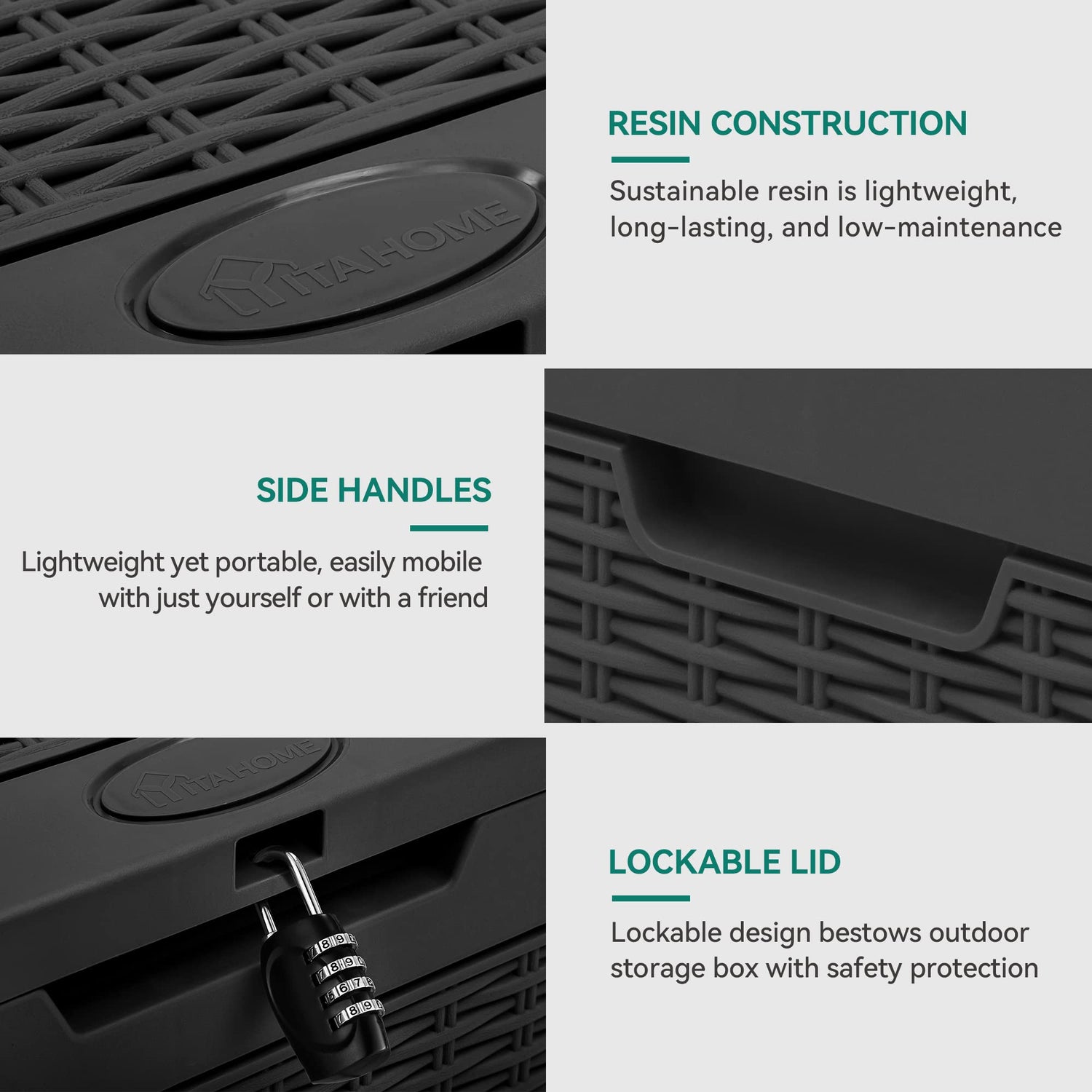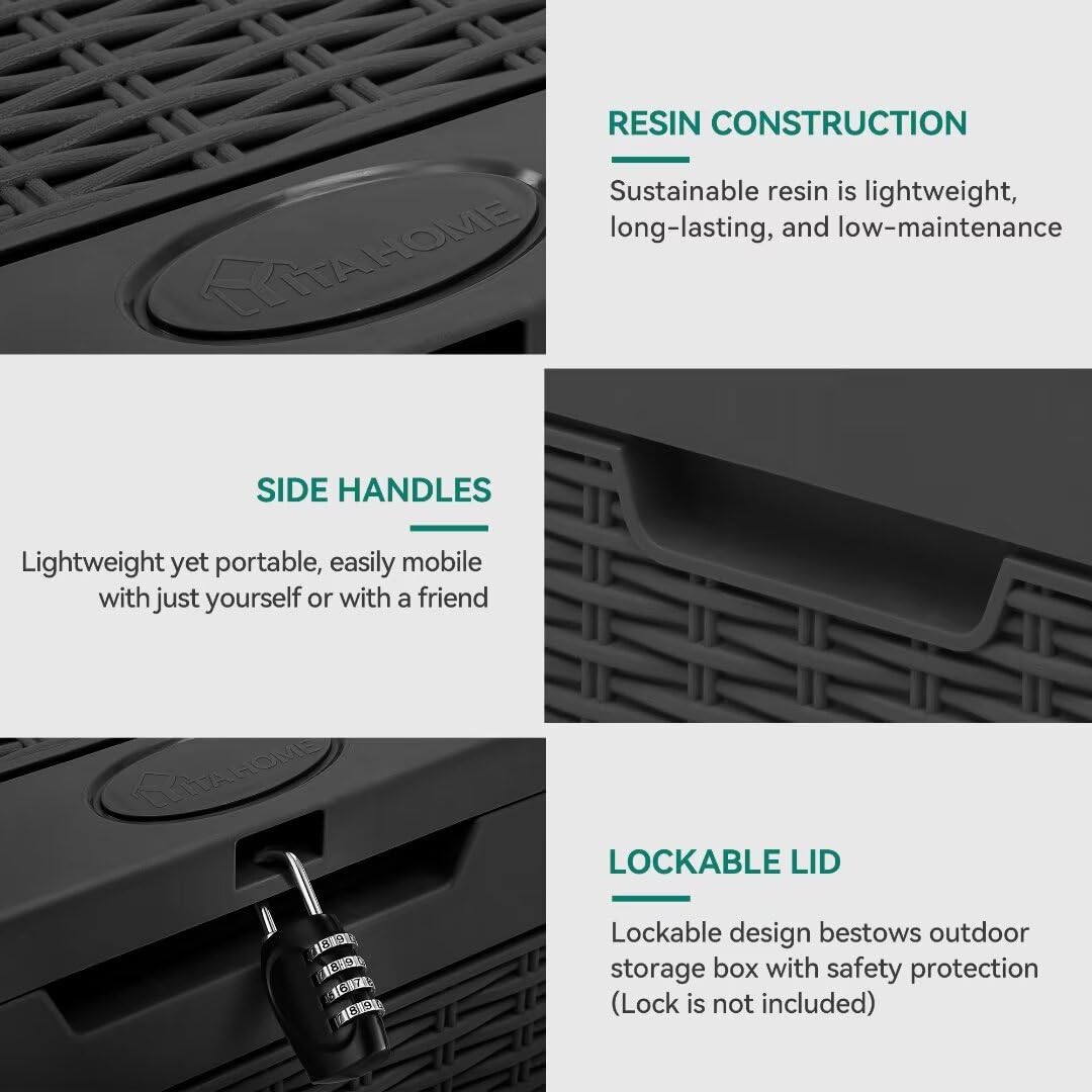 - DESIGNED FOR CONVENIENCE- Our deck box has built-in handles on both sides for convenient lifting and movement; Add a combination lock/padlock (not included) to the top lid to offer extra security.