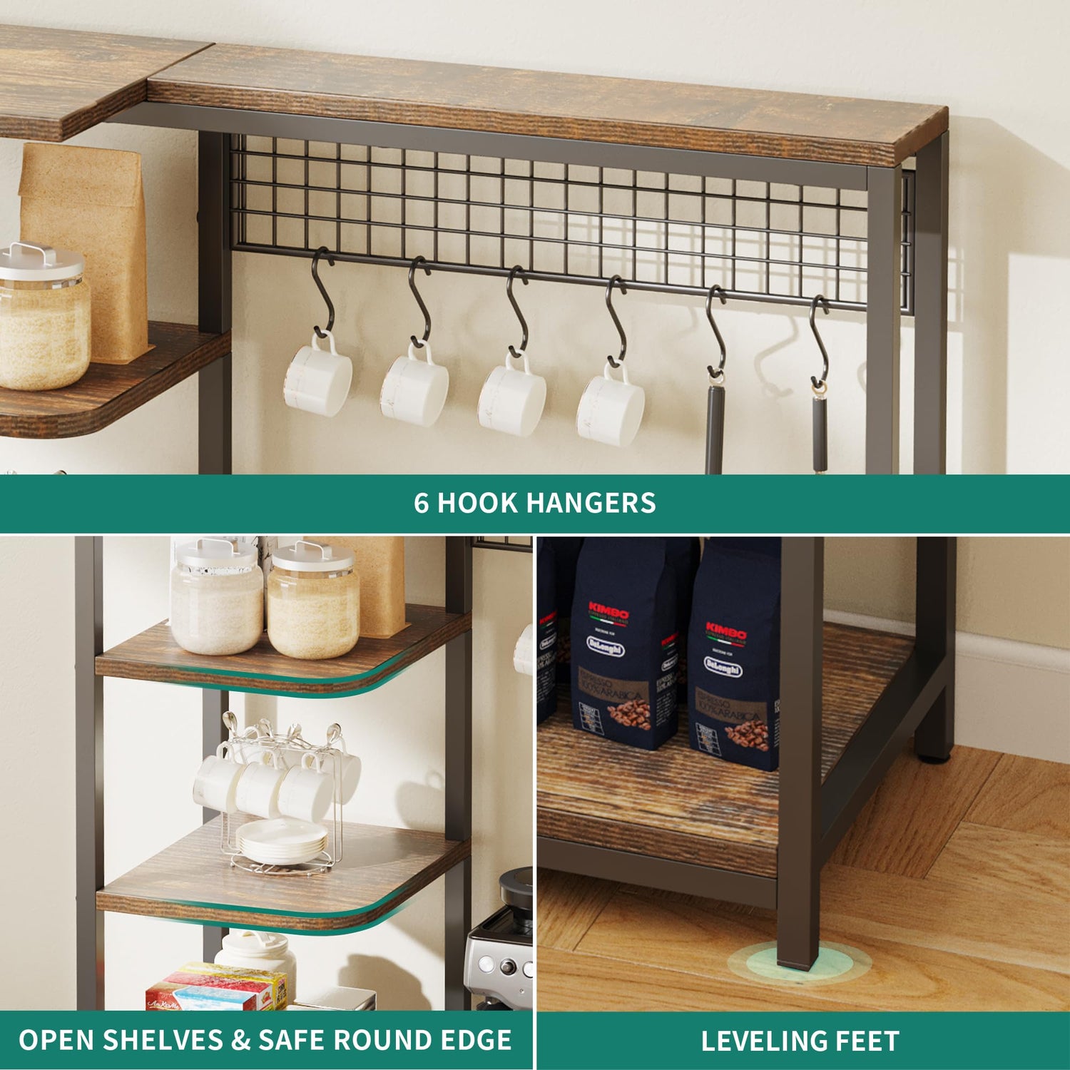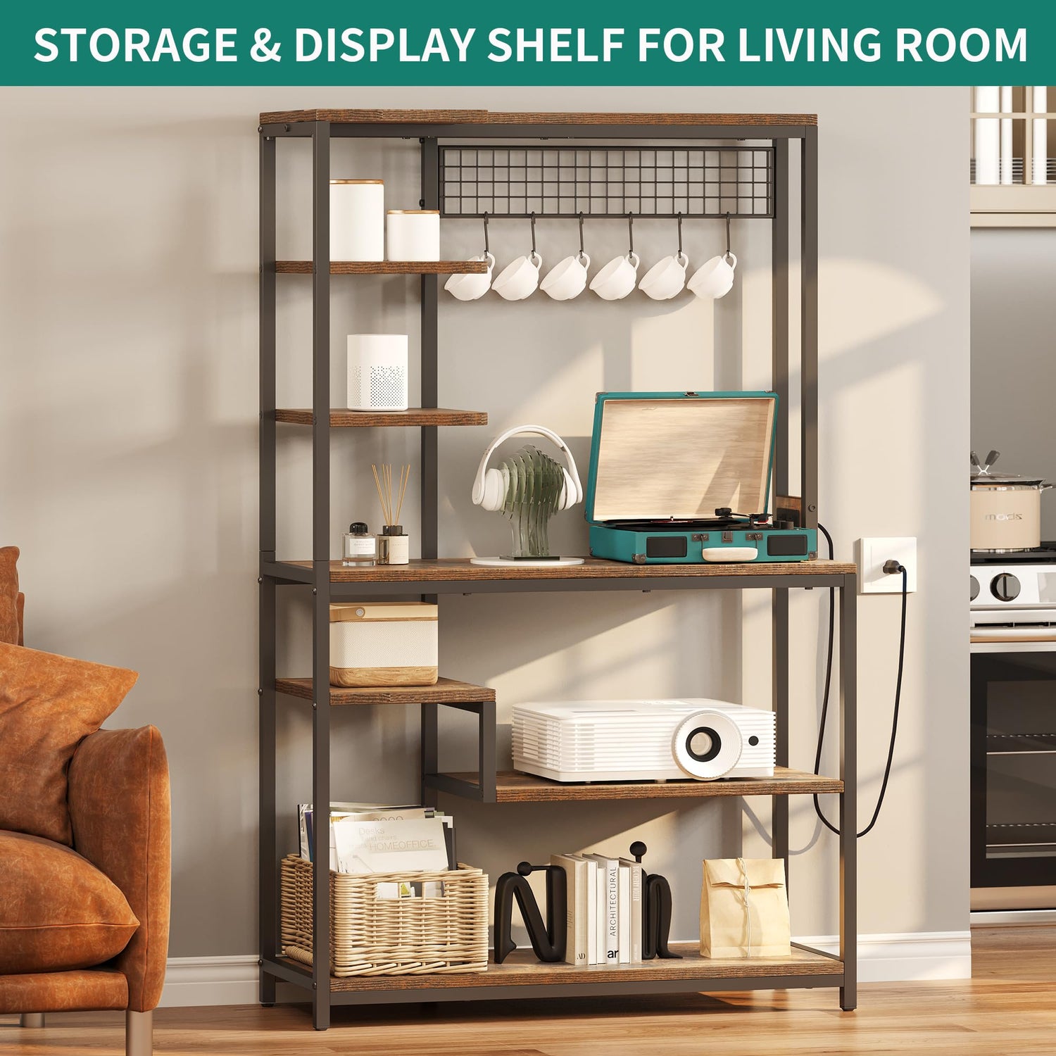 YITAHOME 39 Inch Rustic Brown Kitchen Microwave Stand and Bakers Rack with Power Outlet and 6 Hooks
