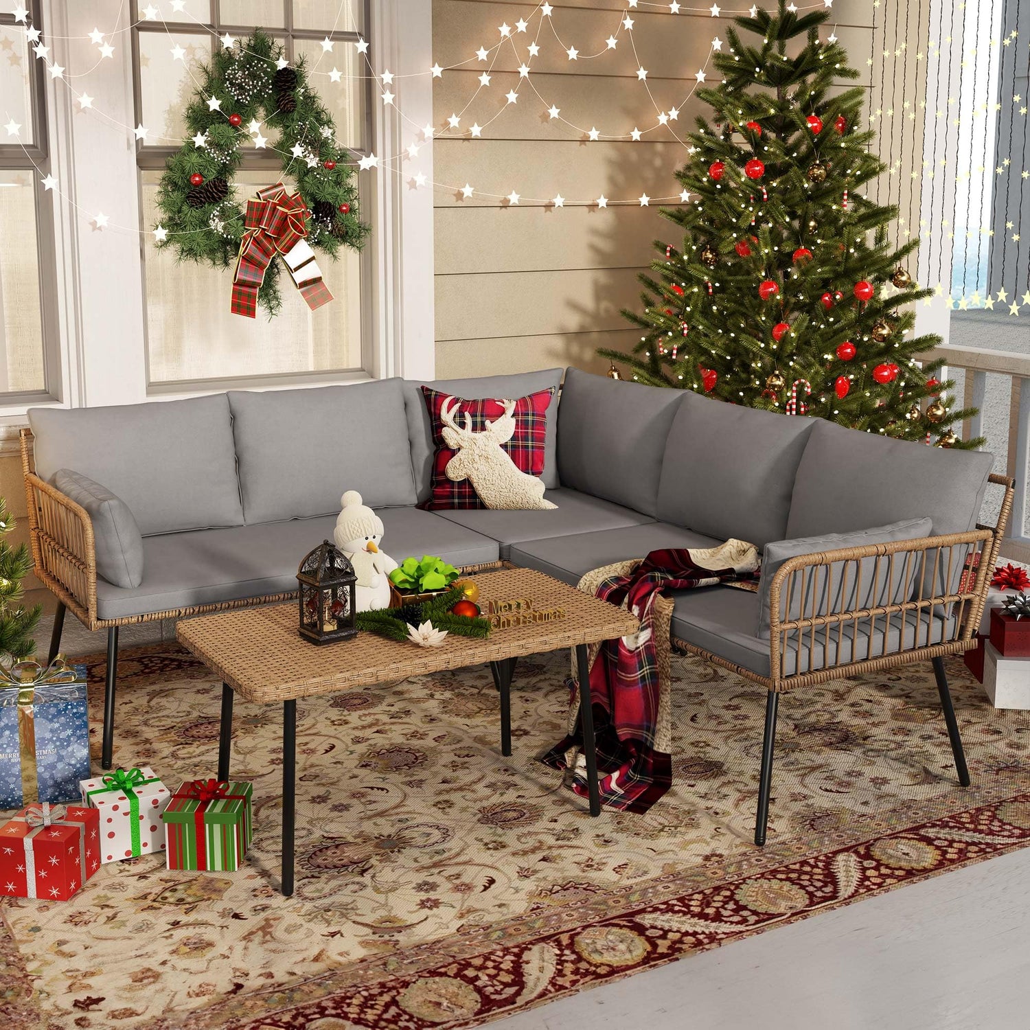 YITAHOME 4 Pieces Patio Furniture Set, Outdoor Wicker Conversation Sectional L-Shaped Sofa with 5 Seater for Backyard, Porch, Boho Detachable Lounger with Thickness Cushions and Side Table - Grey