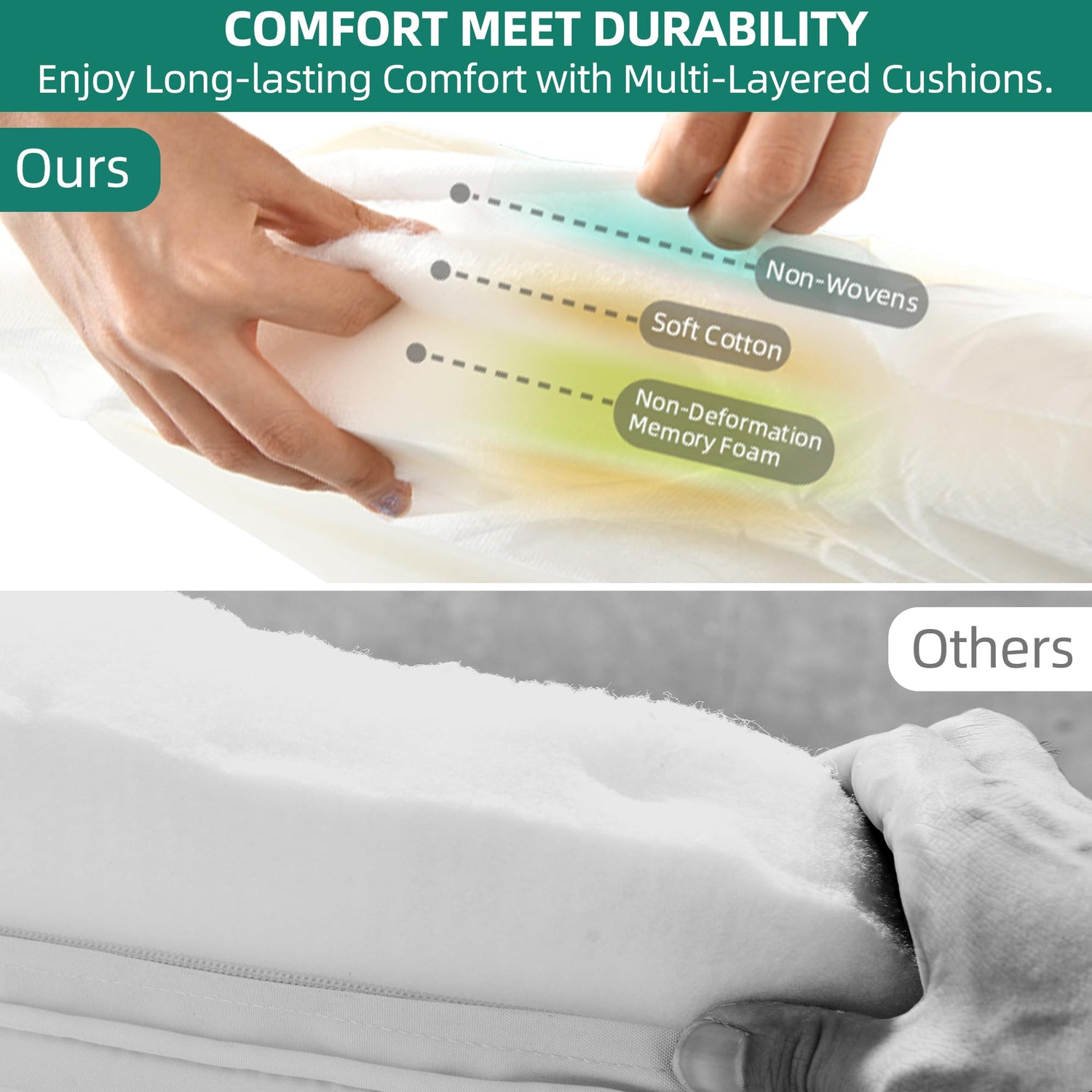 • Comfortable Cushions: Thick and comfortable seat and back cushions with a sleek design provide excellent support to your body, enabling you to enjoy your outdoor space with ease. These cushions feature a 3-layer inner core (non-woven fabric, soft cotton, and memory foam) that is waterproof and helps to prevent deformation while also providing added comfort and quick shape recovery.