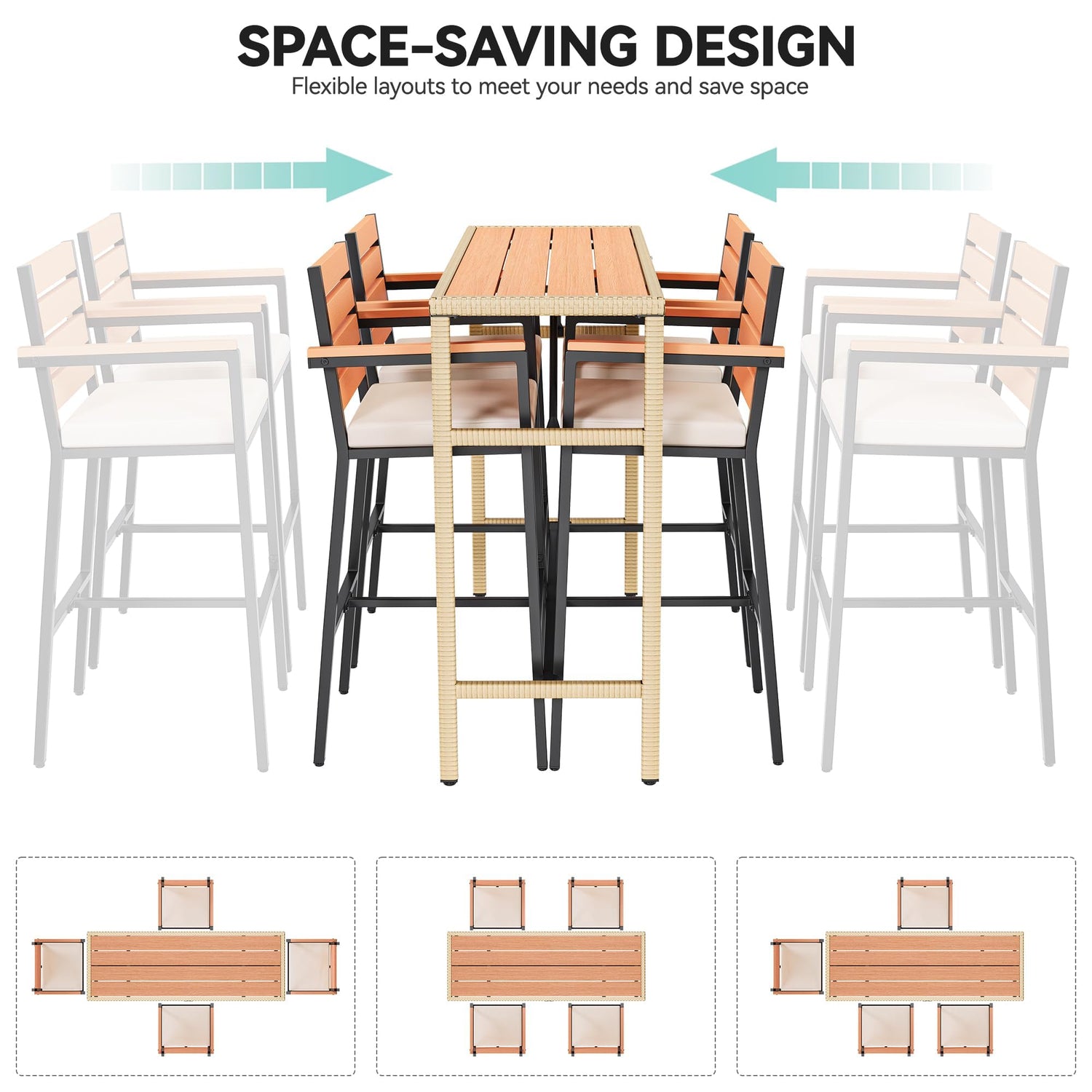 - Space-saving Design: Freely customize the layout of outdoor bar set with stools according to your needs; Conveniently tuck away the bar chairs under the bar table to save space when not in use