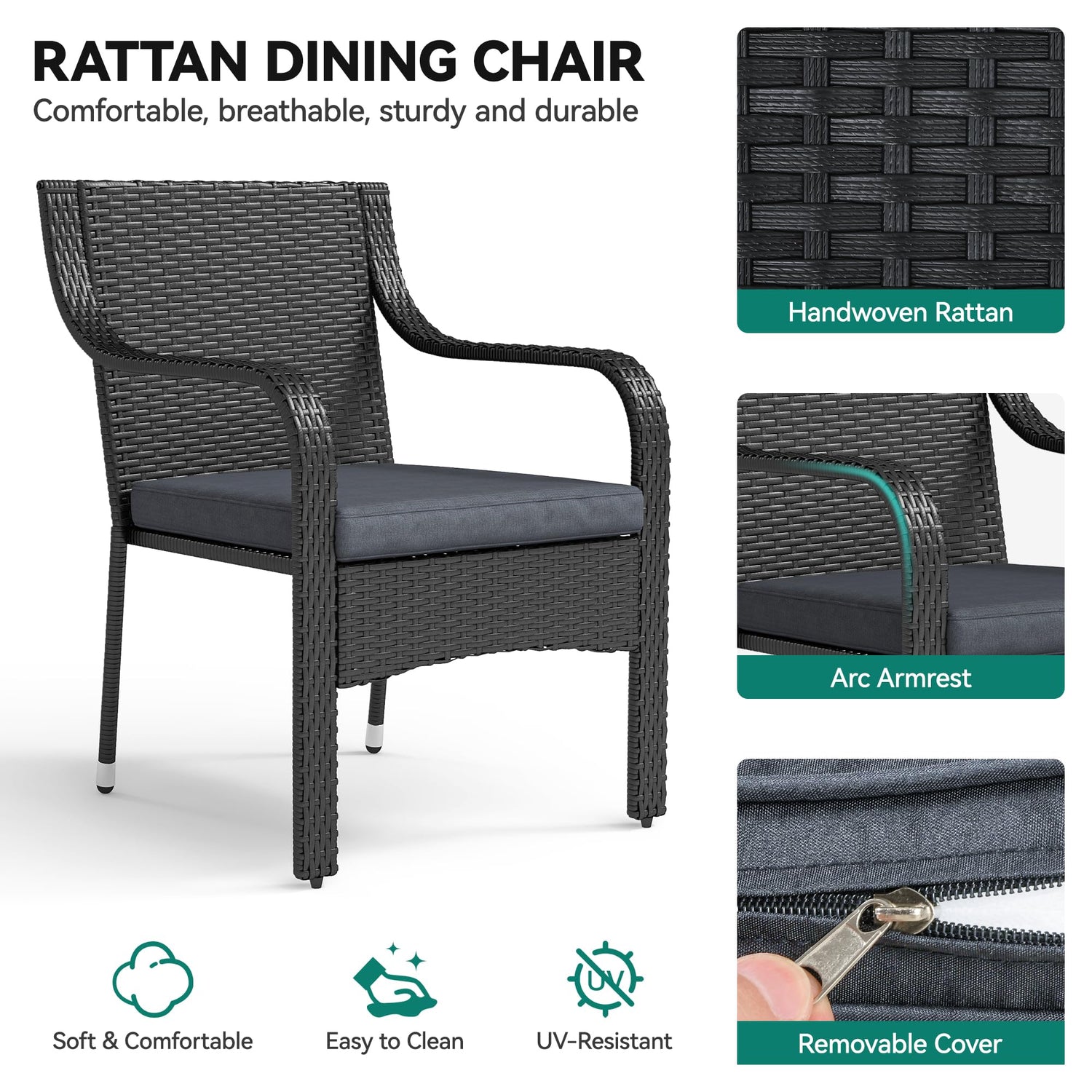 - All-weather Wicker: The weather-resistant wicker of our patio dining set for 4 not only ensures durability against various elements like rain, sun, and wind, but also imbues a natural aesthetic to your outdoor space