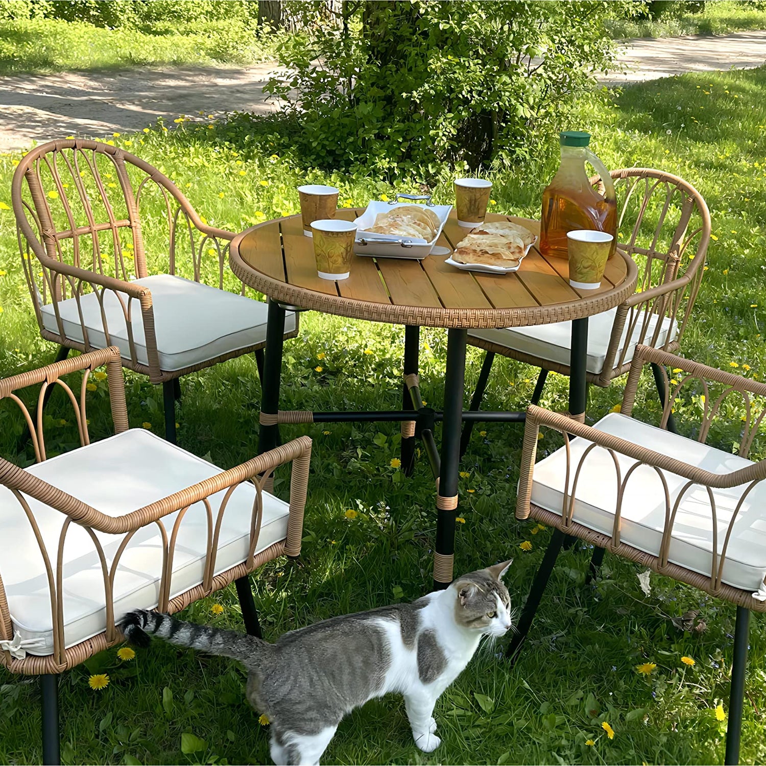 - EASY ASSEMBLY- The garden patio wicker set includes 4 armchairs, 1 wood table and 4 holders with 8 bowls, packed in two parcels. You can choose whether to install 4 attached holders