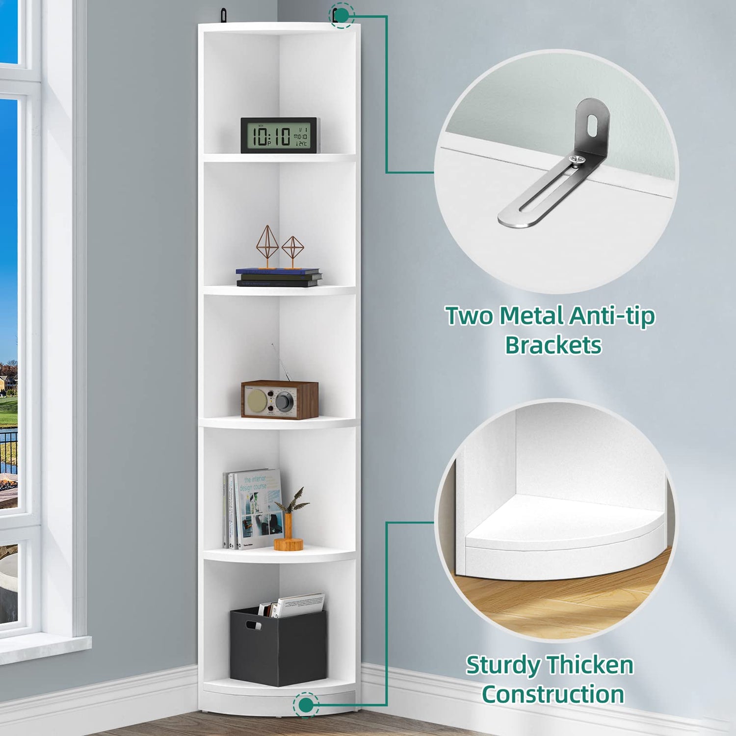 YITAHOME 5-Tier White Corner Bookshelf – Modern Free Standing Display Rack for Living Room and Home Office