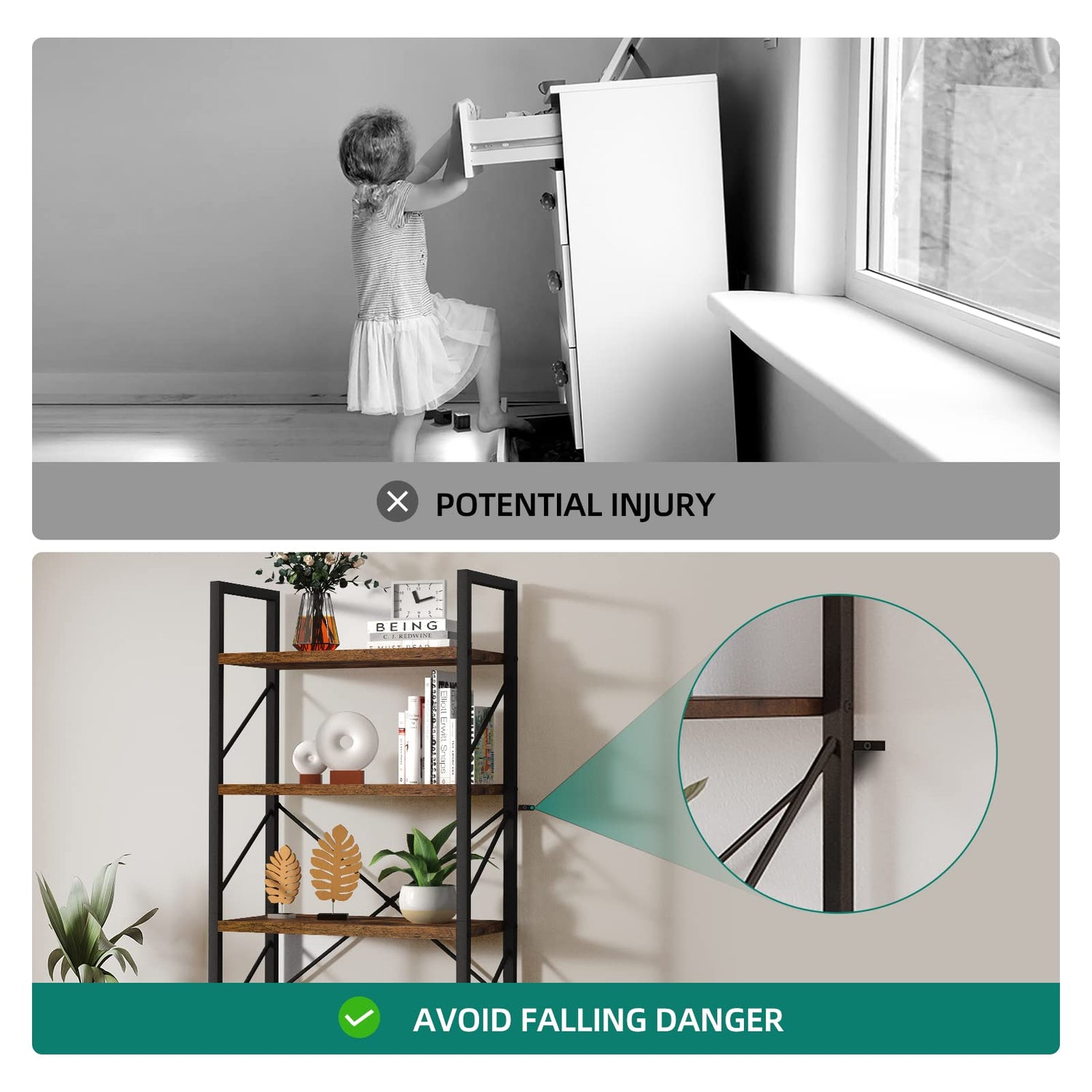 - **Safety First**: Your safety is paramount. The bookshelf includes anti-tip kits, allowing you to secure it to the wall for enhanced stability and peace of mind. All necessary accessories and tools, along with illustrated instructions, are provided for an uncomplicated assembly process.