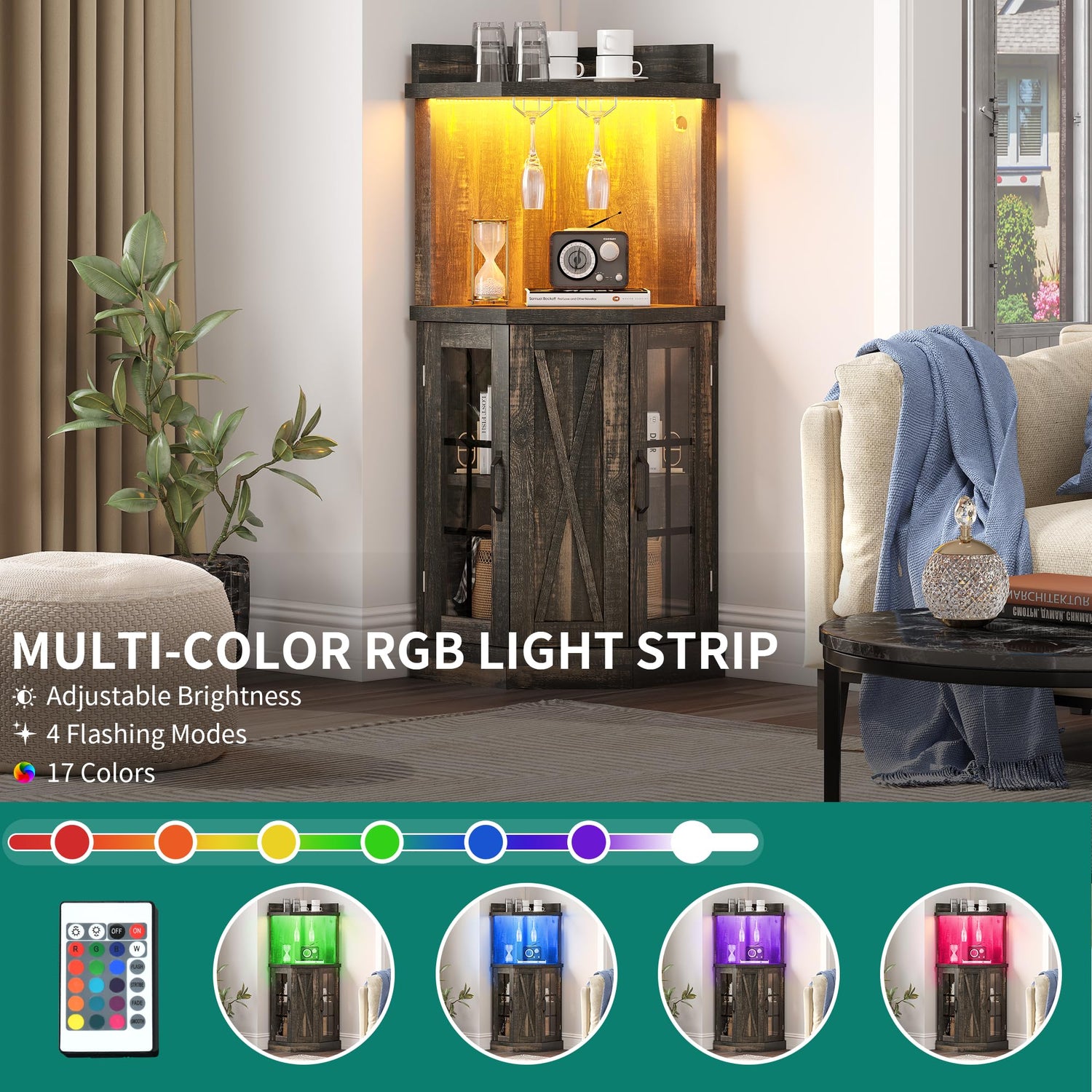 - LED Ambient Light: The home Liquor bar cabinets feature LED light strips with 17 colors, 4 flashing modes, and brightness adjustment, creating a stunning look. This is ideal for wine tasting, parties, and displaying wine collections, as it enhances the ambiance while allowing easy access to your bottles.