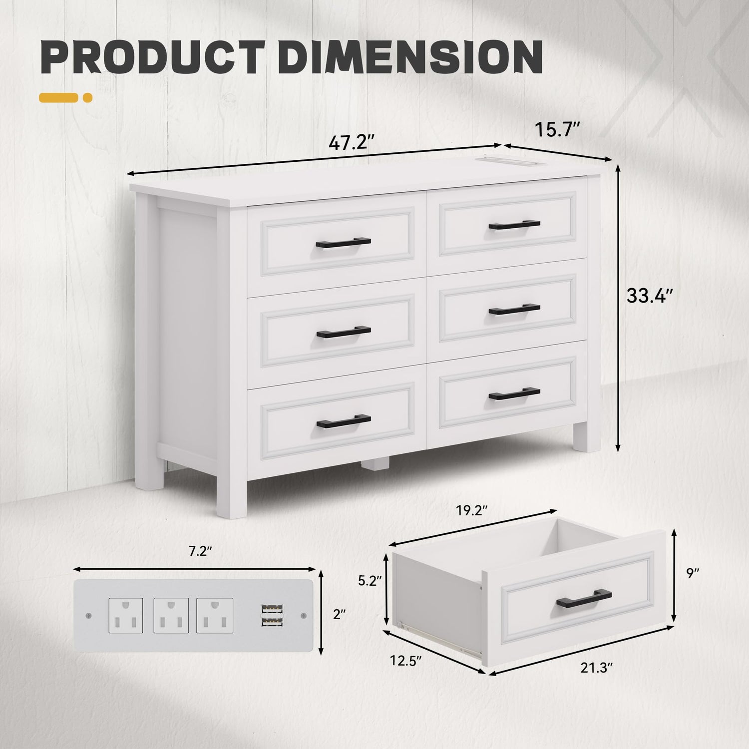 - Elegant Addition: Embrace the rustic charm of our farmhouse 6 drawer dresser, measuring 47.2" x 15.7" x 33.4"; With a sleek white finish and distinctive bar handles, this dresser TV stand adds a touch of aesthetic appeal to your hallway, living room, or entryway