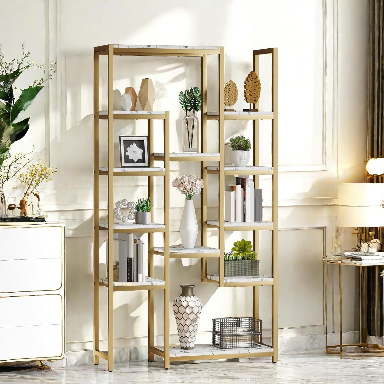 - Large decorative storage space: Featuring 12 storage areas, the large bookshelf helps classify & display your books, collections, framed photo, etc, keeping your home office tidy and organized. Designed with a golden frame and white marble veneer, the display storage bookshelf brings a touch of deluxe and minimalist to your home