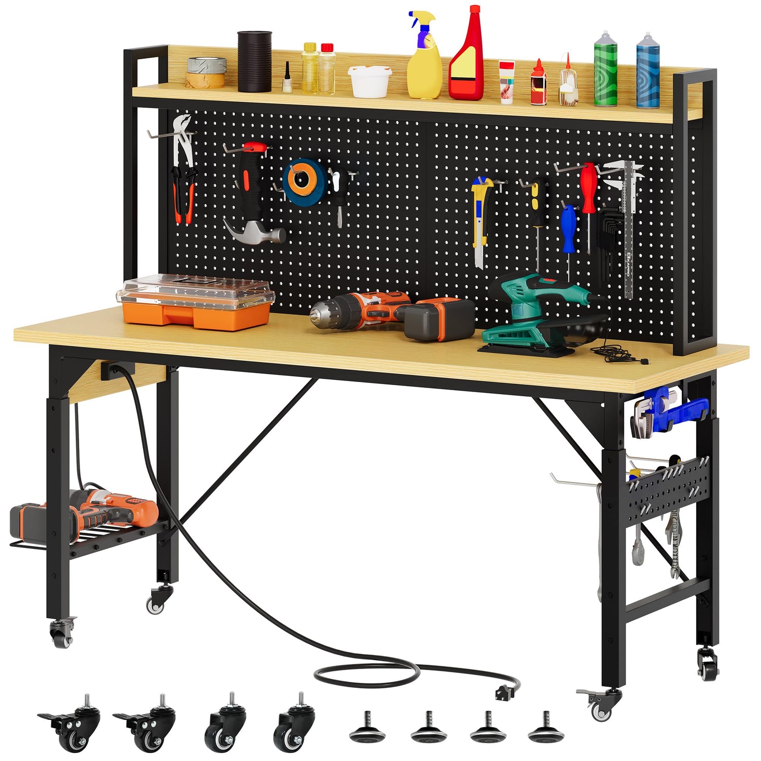 YITAHOME 60" Adjustable Workbench with Pegboard, Wheels & 1600 LB Capacity, Rolling Work Table with AC/USB Outlets, Hooks, and Rack, Heavy-Duty Work Bench for Garage, Workshop, Office, or Home